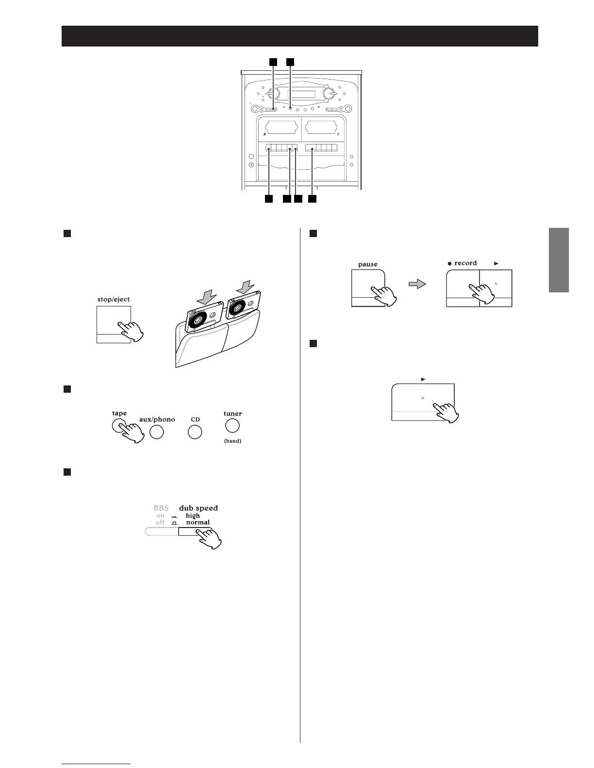 Press the PAUSE button and the RECORD button of TAPE @.