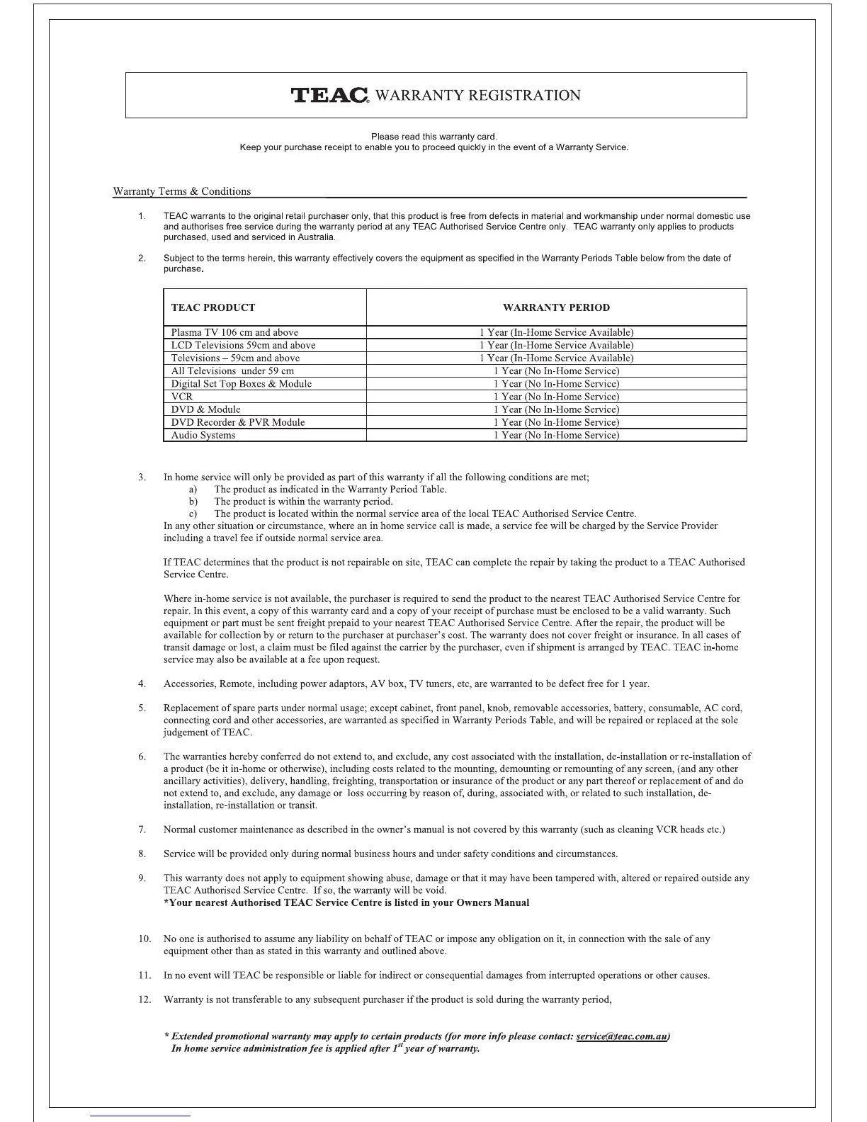 Teac HDB843 - TEAC WARRANTY REGISTRATION; Warranty Terms & Conditions