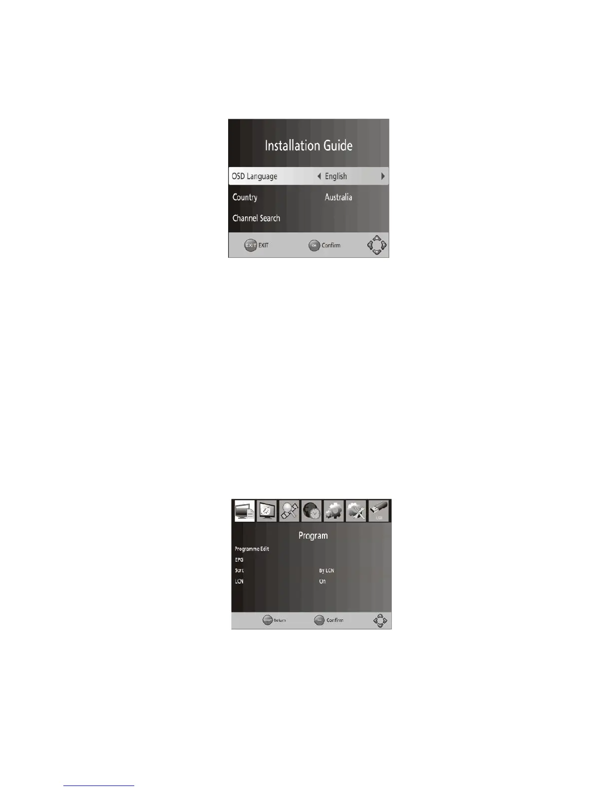Channel Search: Press RIGHT or OK key to begin an automated channel search.