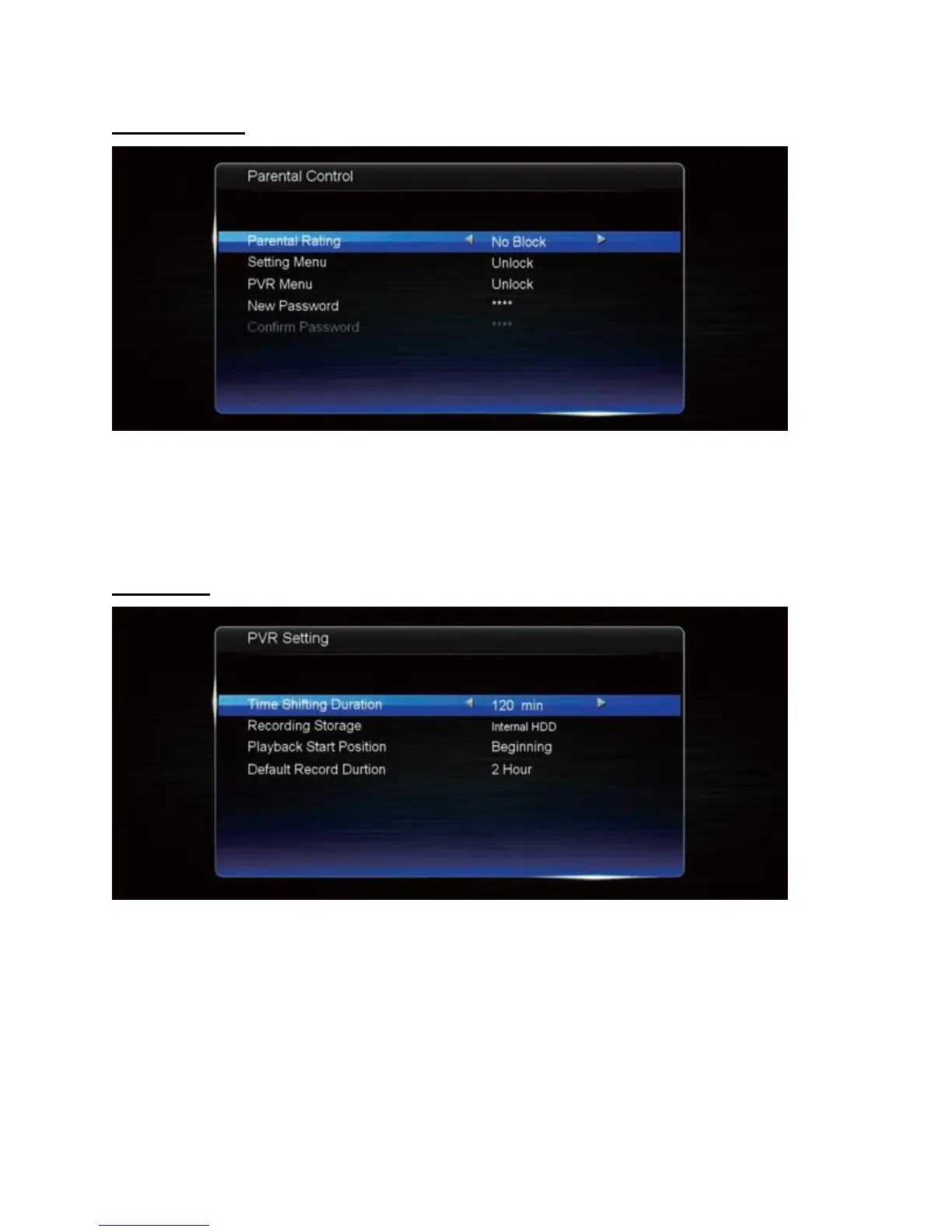 • The PVR Setting menu is Time Shifting duration: set the time shift duration limit.