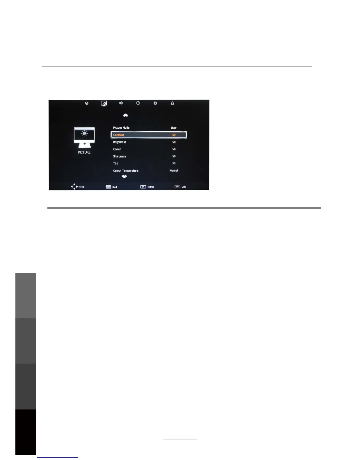 Note: Contrast, Brightness, Colour and Sharpness in the Picture Mode settings can only
