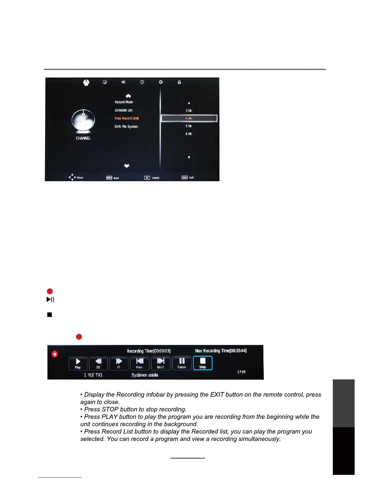 Record Start in the menu and press OK button in DTV mode. (You can also start recording by press-
