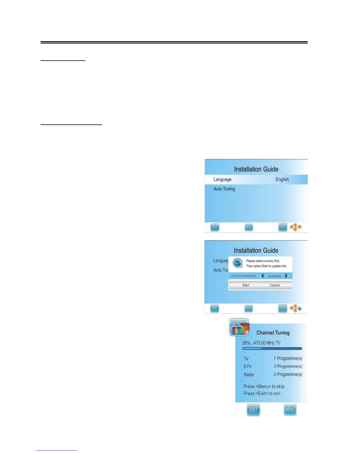 installation guide setup. It helps to quick set the language and get the channels.