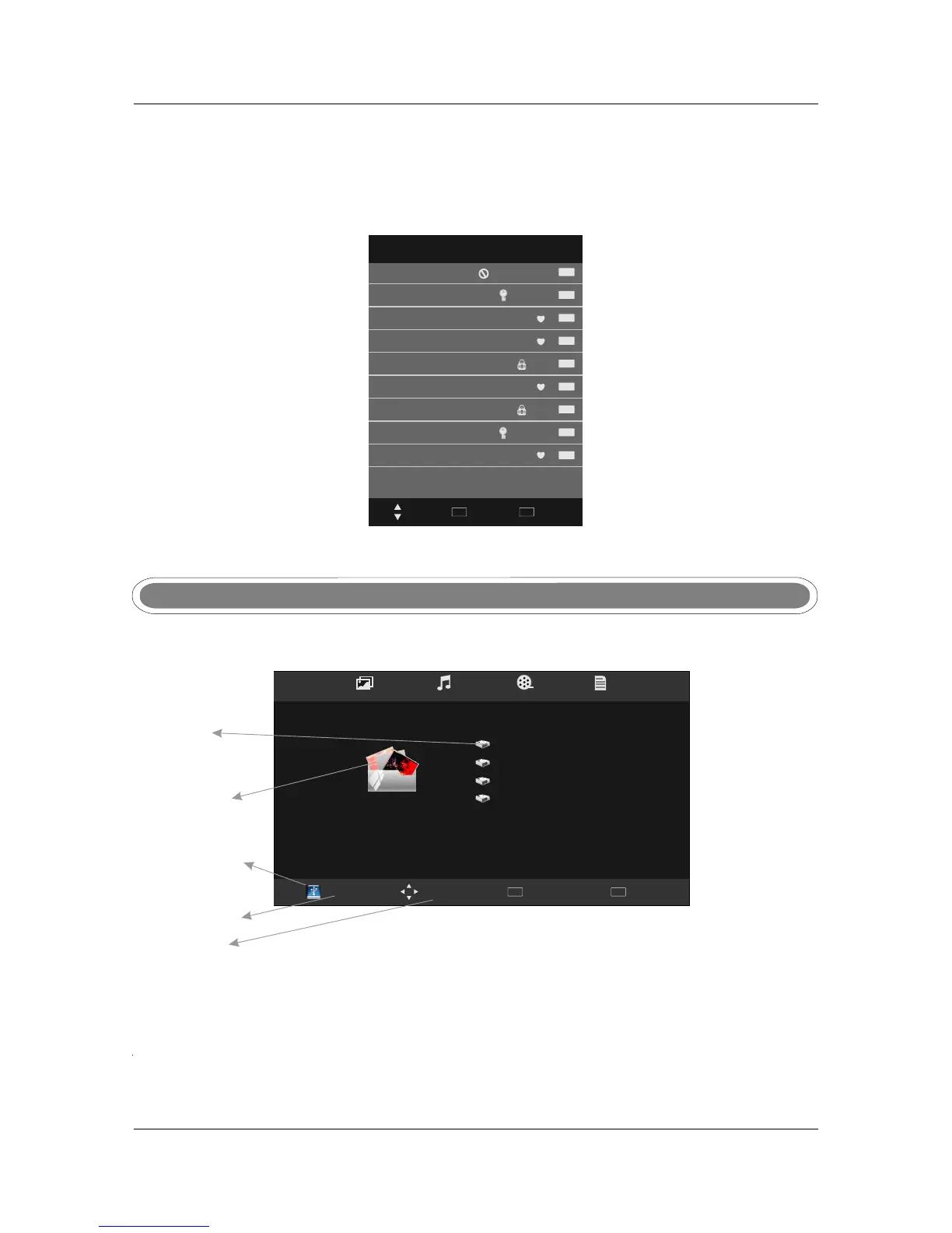 The status of the channels (Skip/Lock/Favourite) will also be displayed, see below.