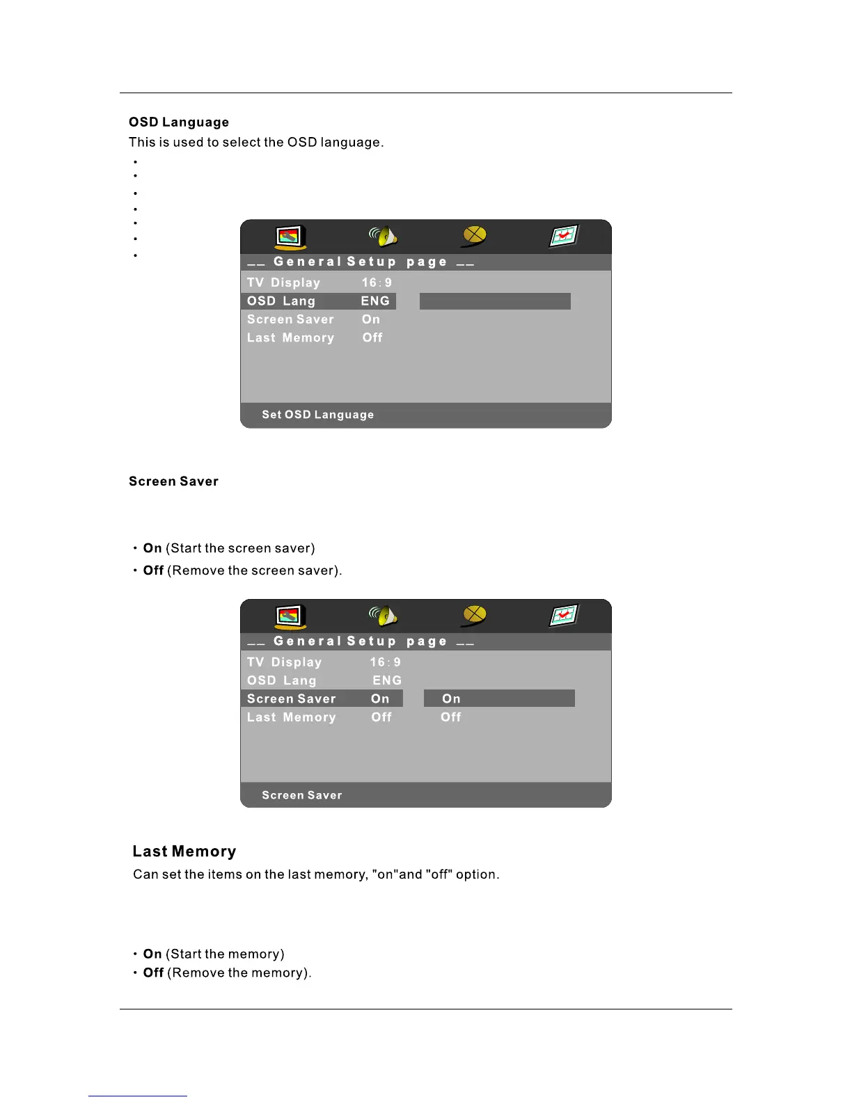 When "Off" is selected, unit will start playback from the beginning regardless of disc.
