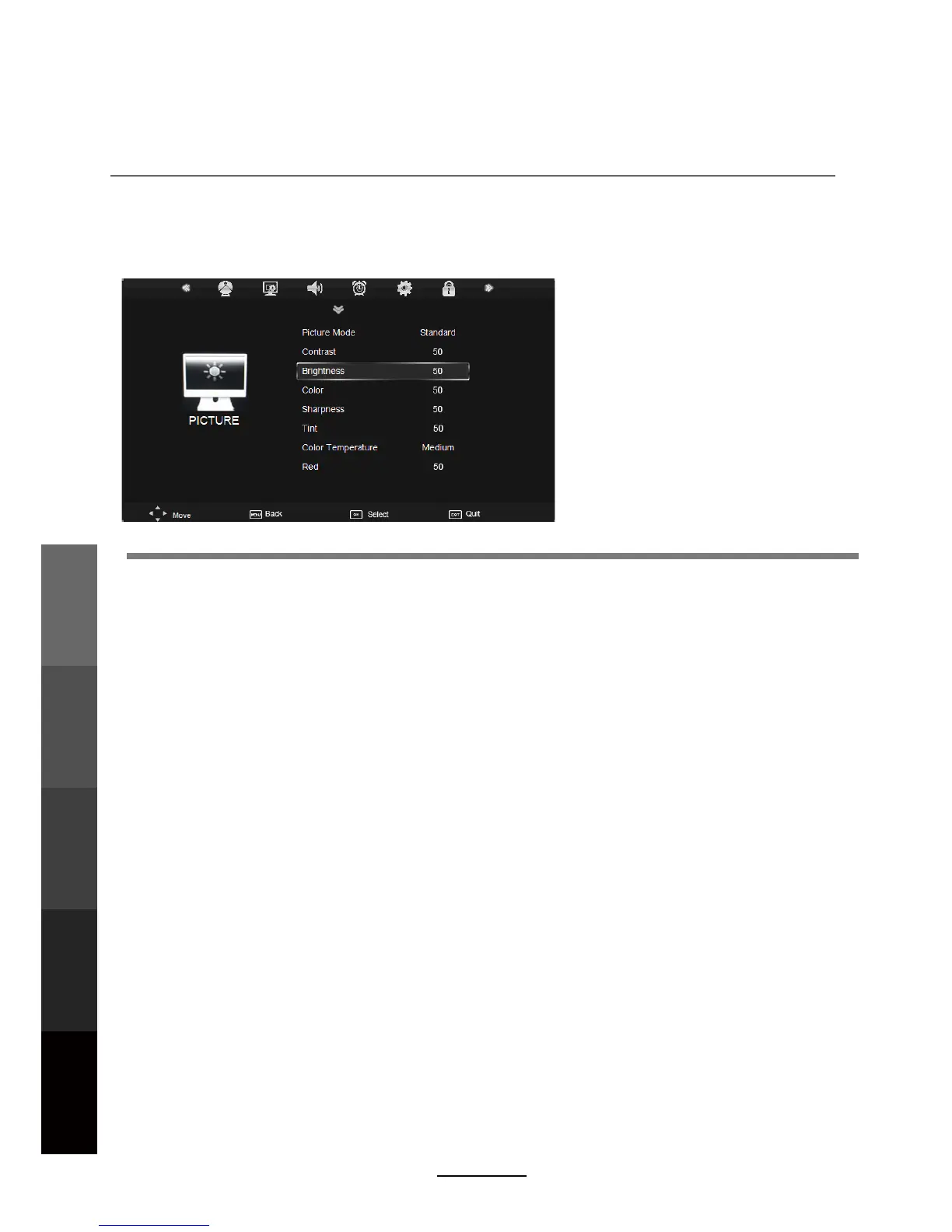 Brightness: Adjust the overall brightness of the picture.