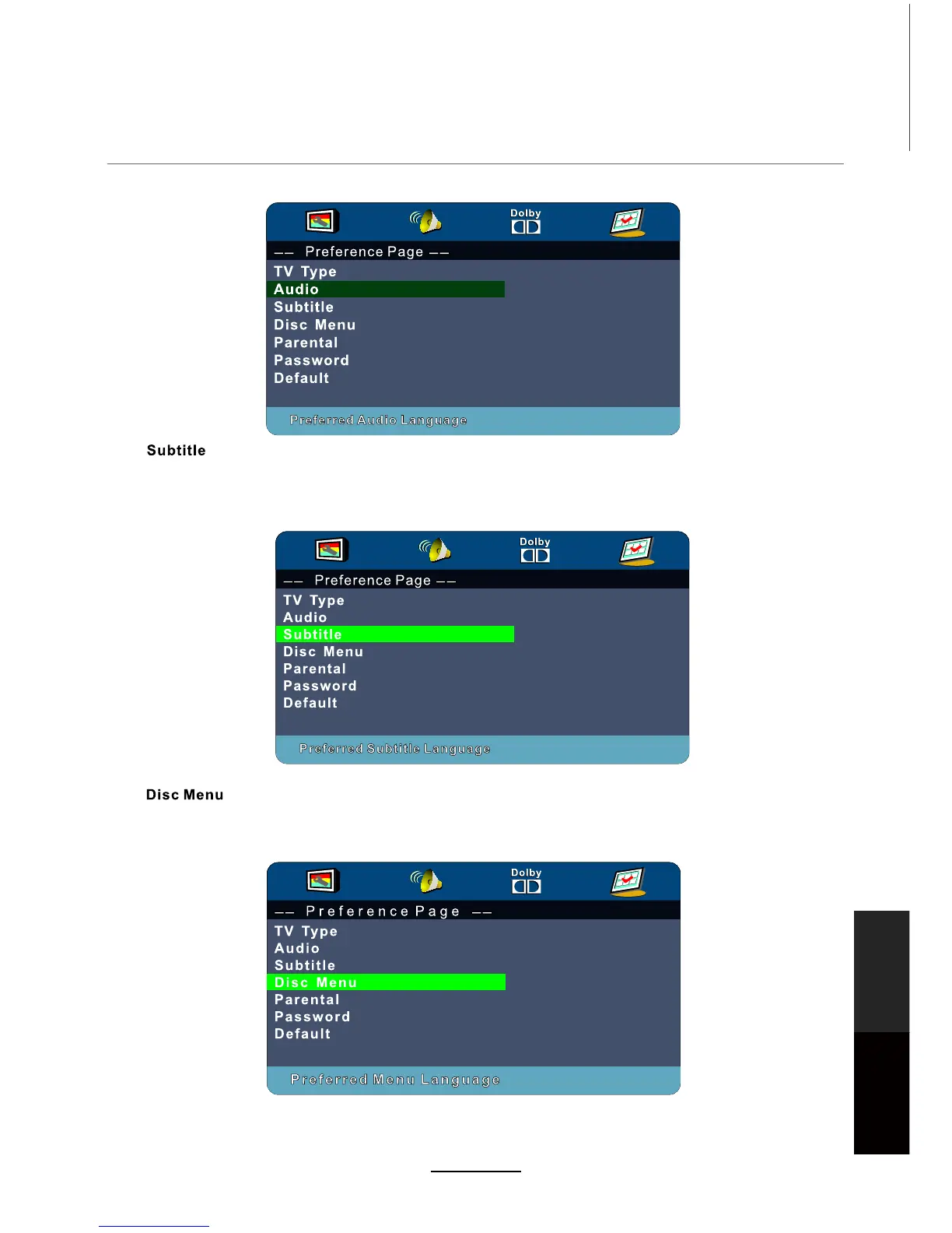 Choose a preferred subtitle language to be used if it is available on the disc. If it is not available, the default
