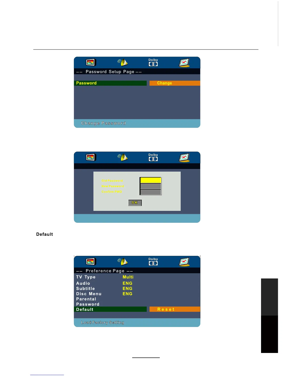 Reset the DVD settings to the original factory settings by choosing RESET and pressing the OK button.