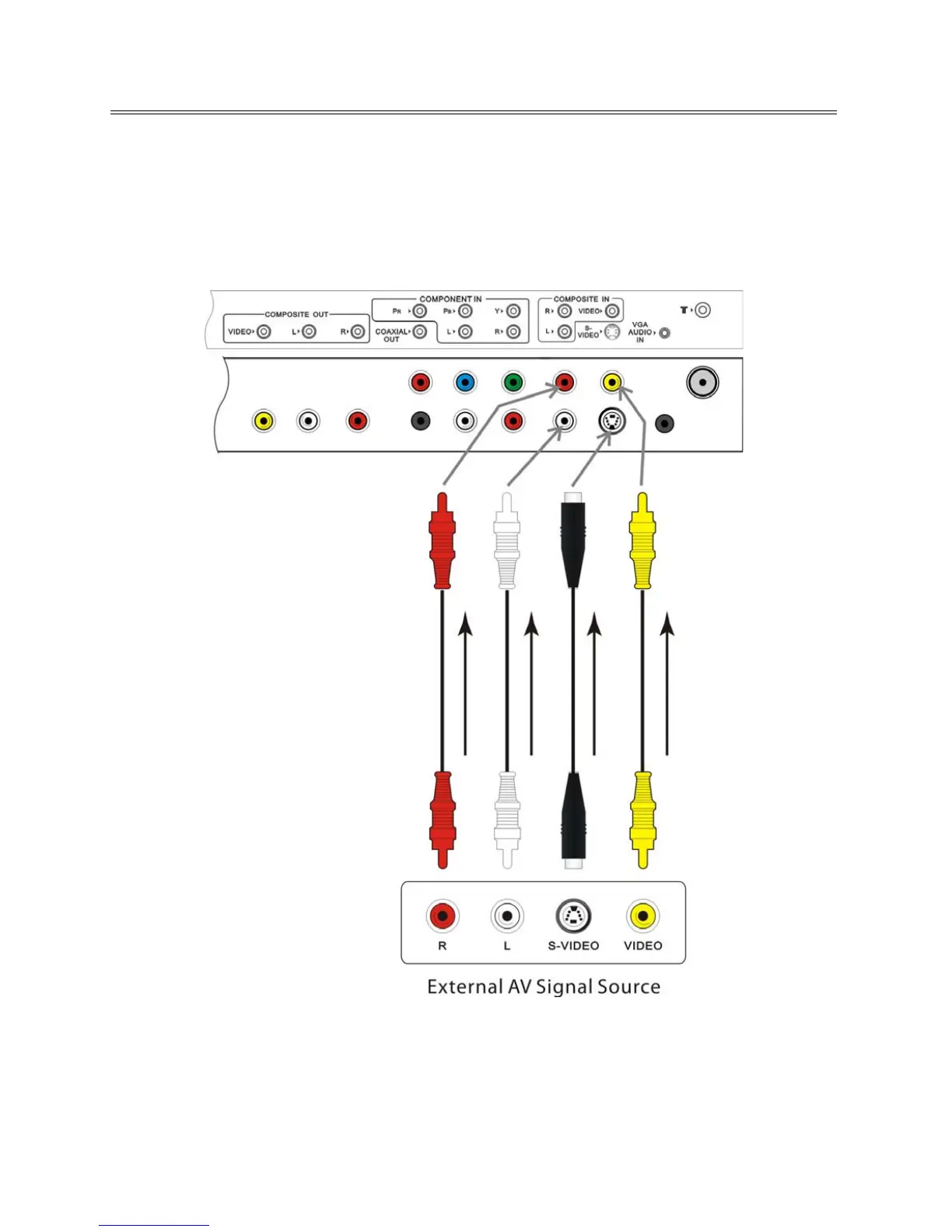 Use the AV cables to connect the external AV signal source to the AV input jacks on the rear panel of the