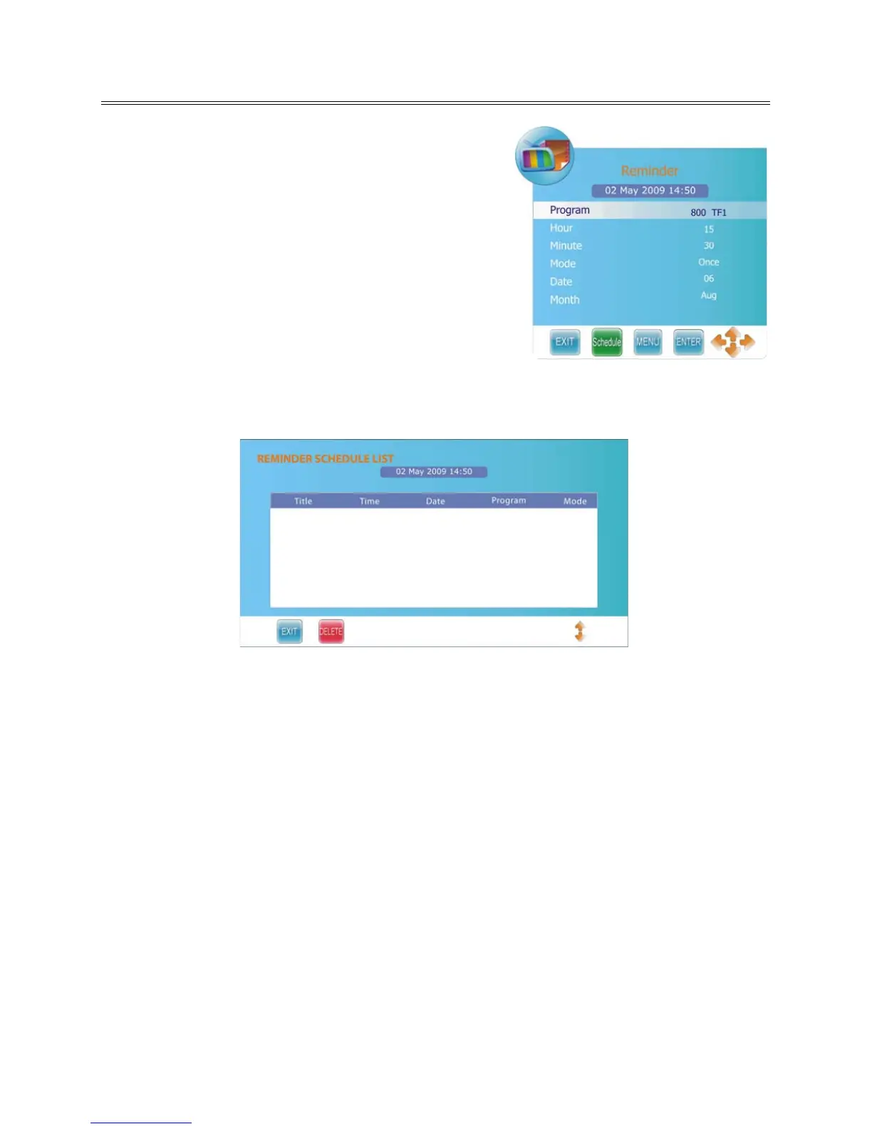 Within the Reminder menu above, press the green button to display the program reminder schedule list,