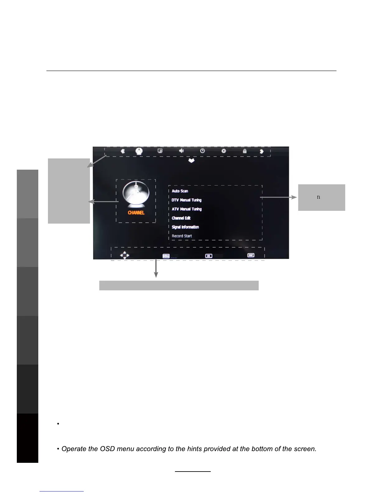Use the </> direction buttons to make a selection from the main menu (CHANNEL,