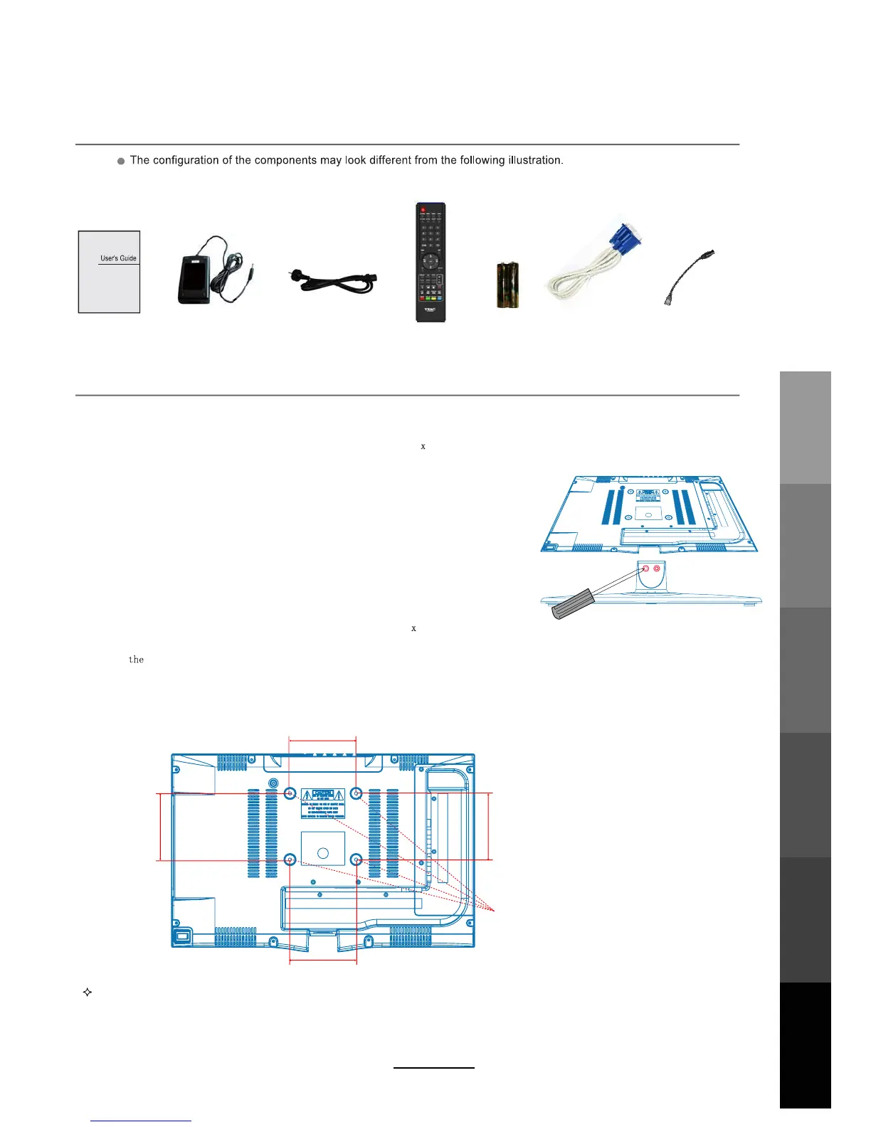 We recommend removing theTV stand prior to mounting the TV on the wall. Please refer to the figures and procedure below.