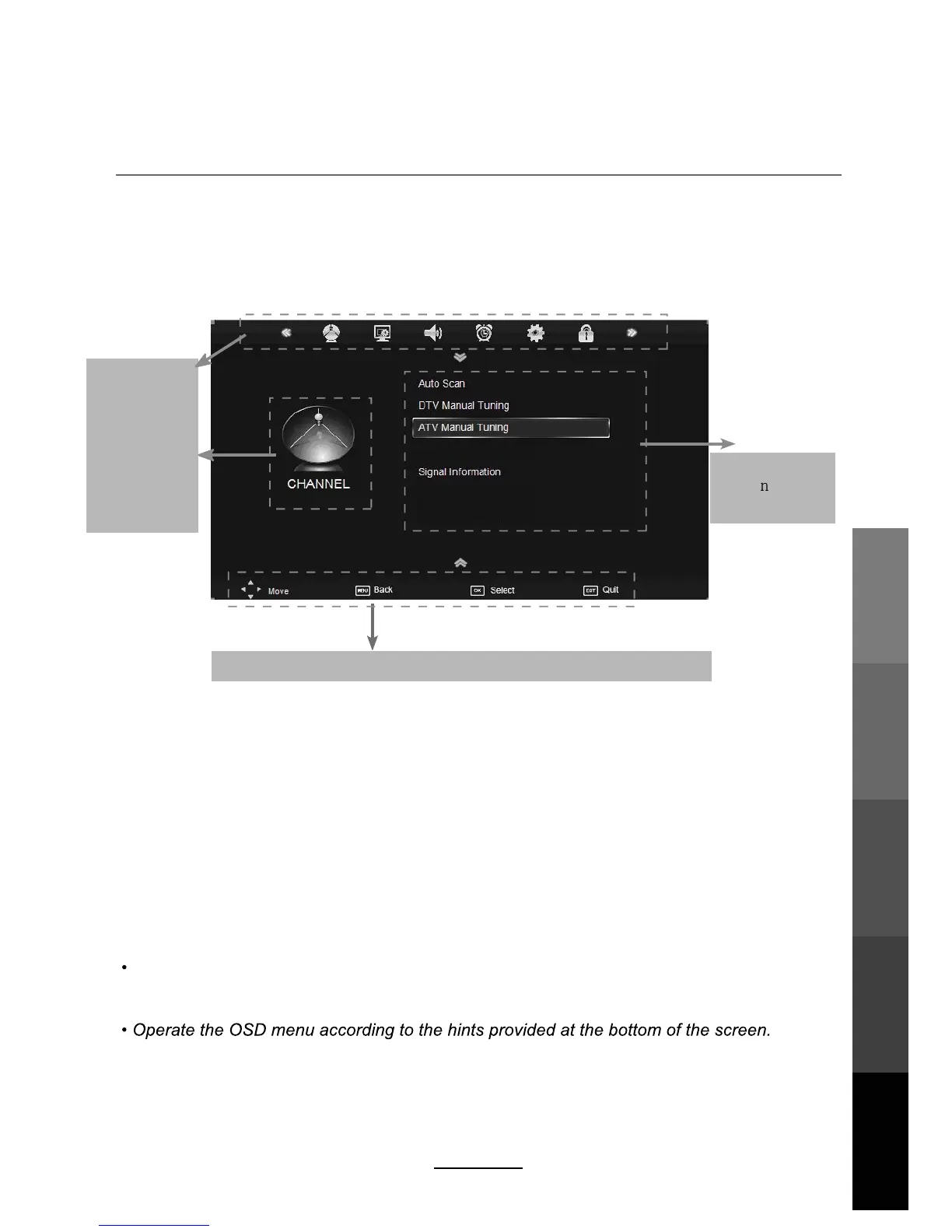 Use the </> direction buttons to make a selection from the main menu (CHANNEL,
