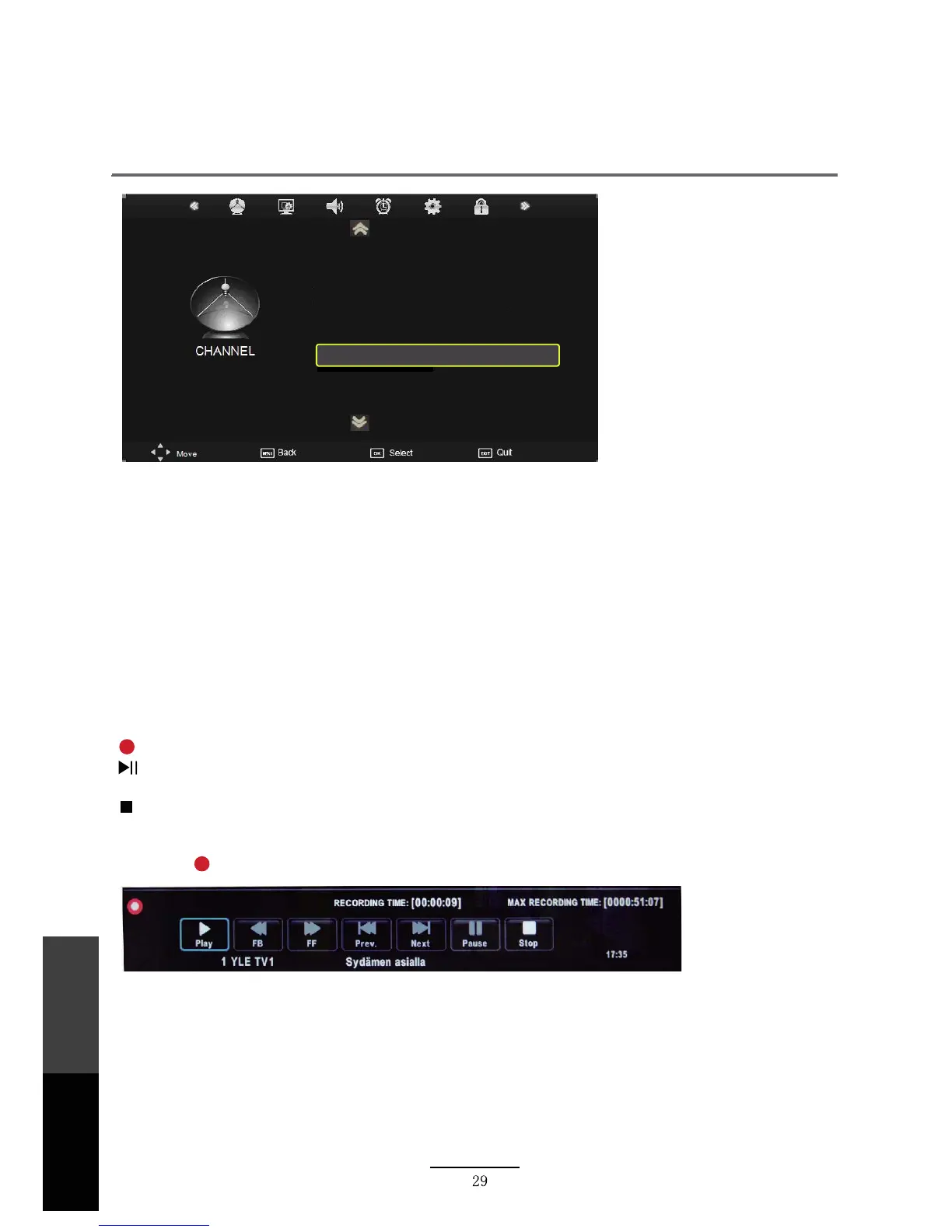 Record Start in the menu and press OK button in DTV mode. (You can also start recording by press-