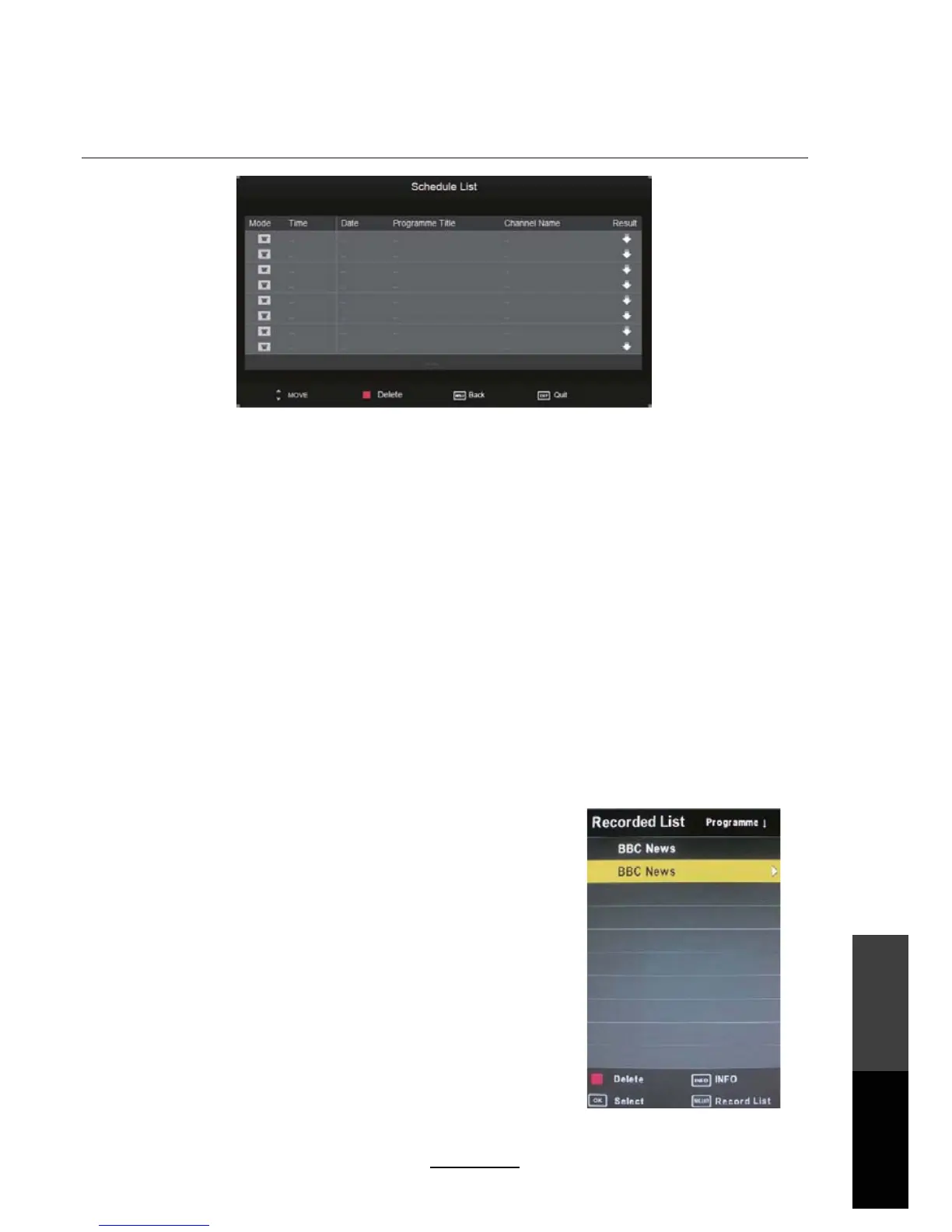 After the recording has been done, the stored programs can be viewed through a Recorded List by