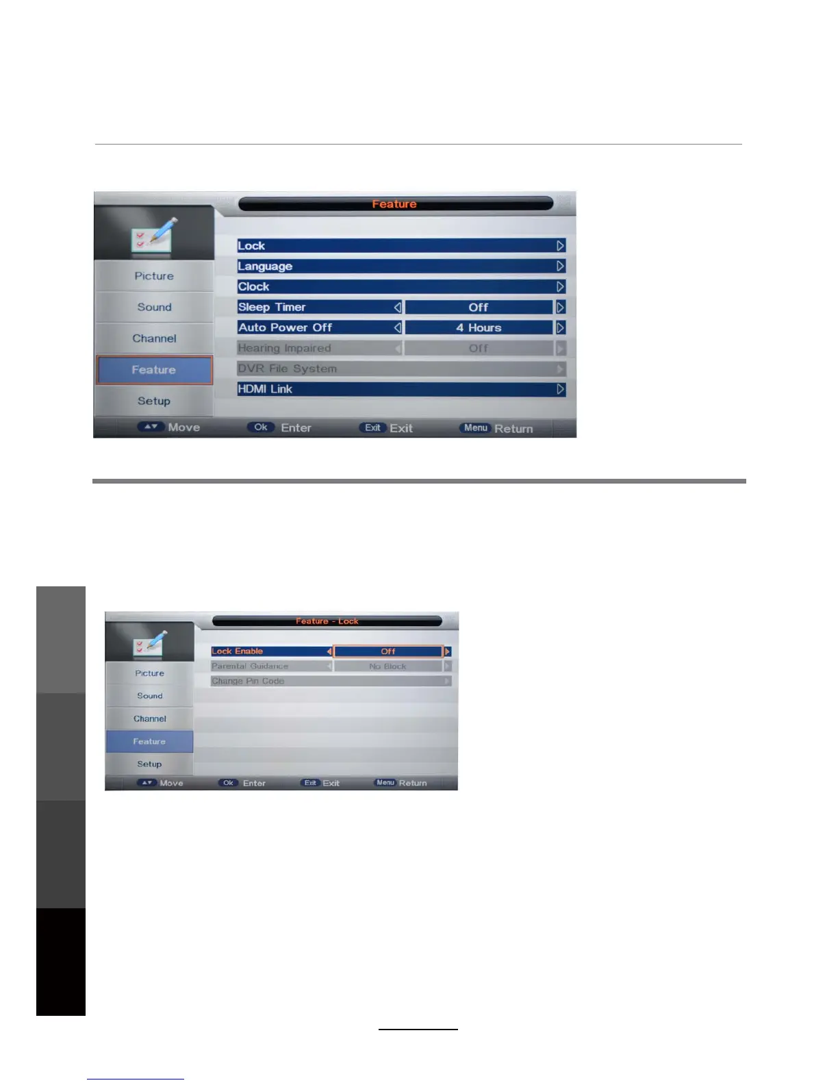 Lock: This menu allows you to lock certain features of the television so that they can not be used