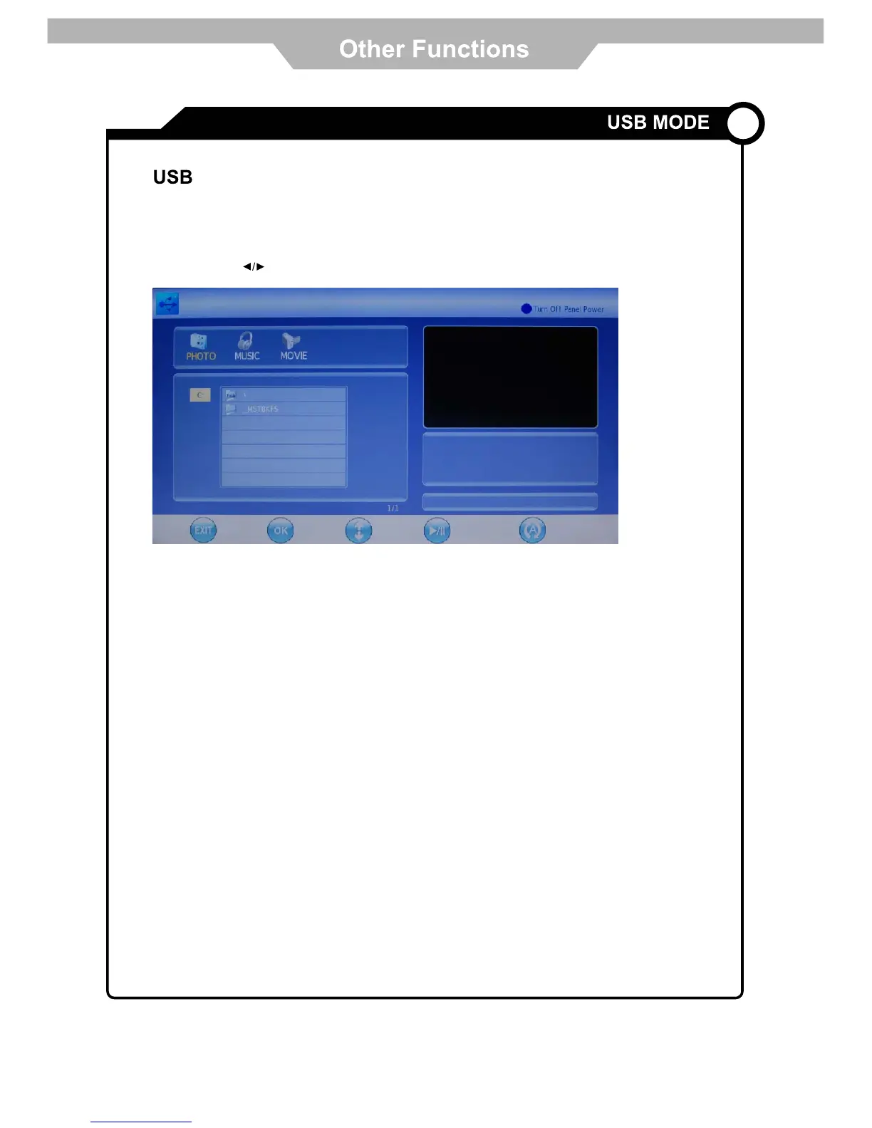 press OK button to access USB mode. The compatible audio, video and photo files will be displayed at the following