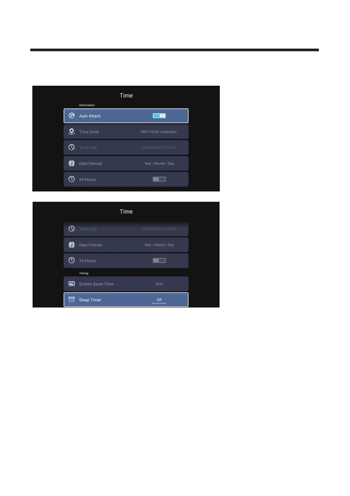 Press / button to select Auto Attach/Time Zone/Daylight Saving/Time Edit/Date Format/▼ ▲