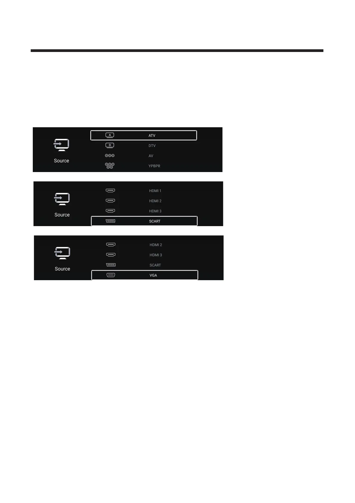 Press button to select ◄ / ► ATV/DTV/AV/YPBPR/HDMI1/HDMI2/HDMI3/SCART/VGA.