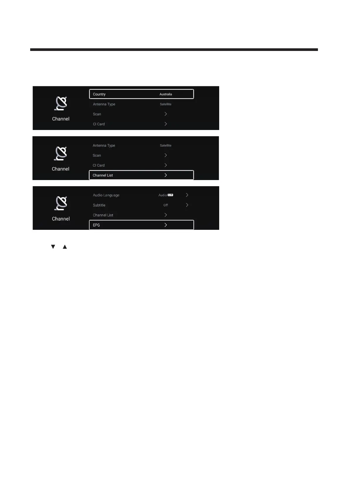 / button to select Antenna Type.Press / button to select Air/Cable/Satellite.