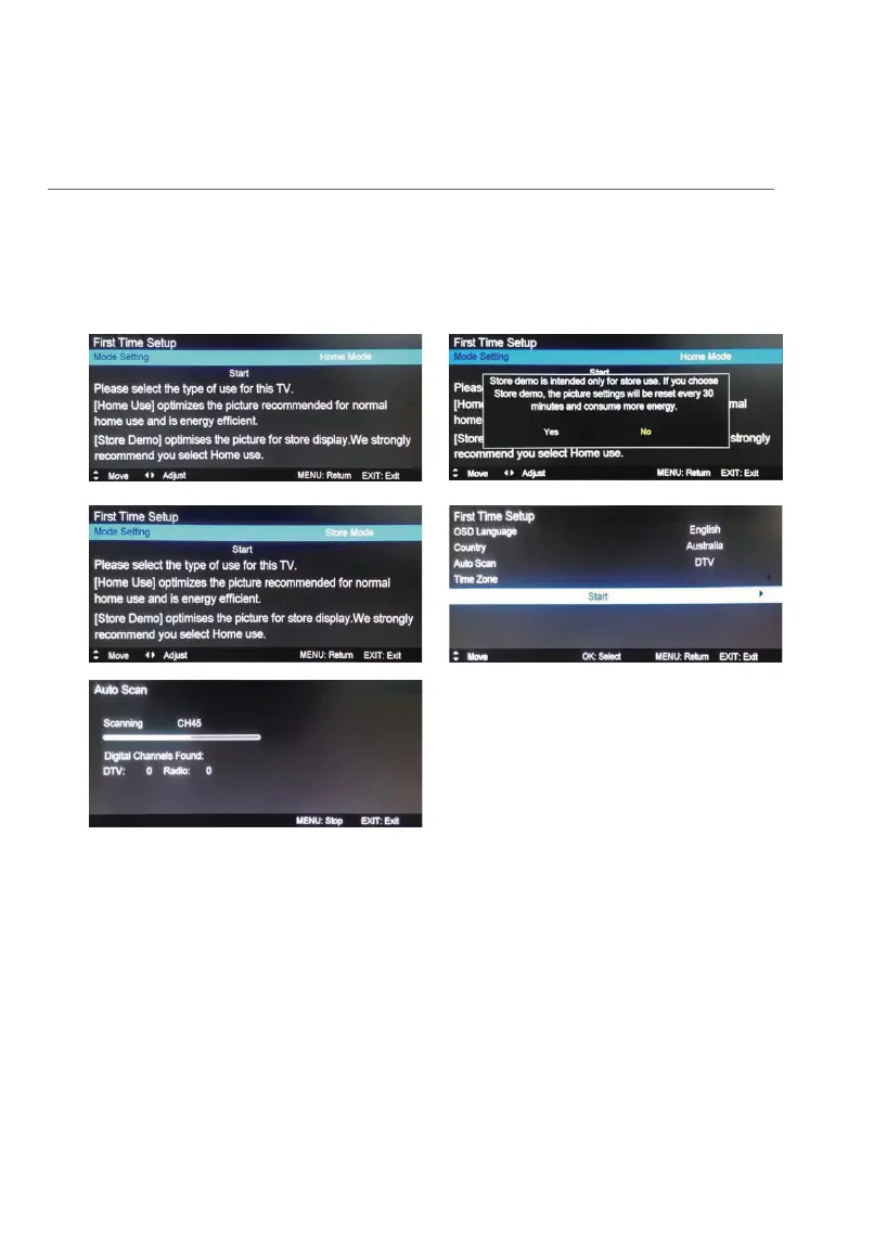 2. Select Type,OSD Language,Country,Auto Scan,Time Zone then press the OK button to start