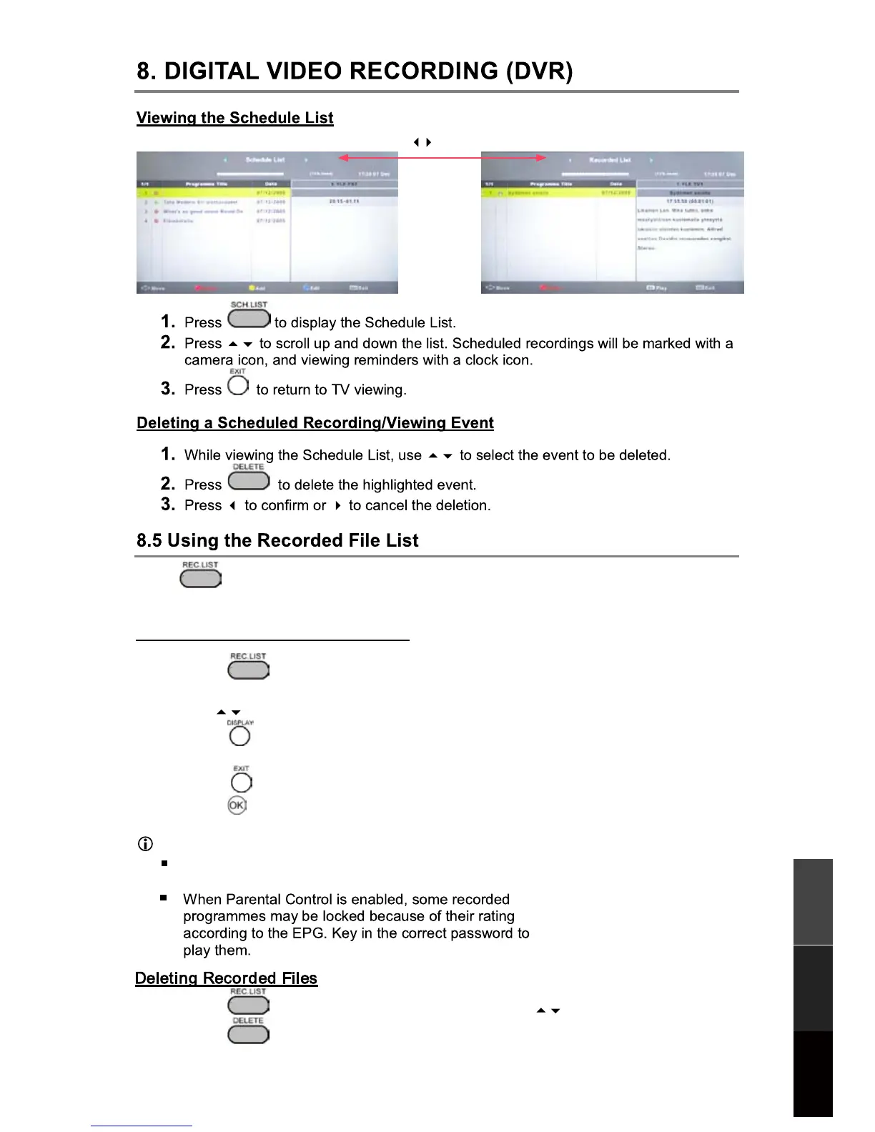 Press to access the Recorded File List. Any recorded TV programmes will be listed if