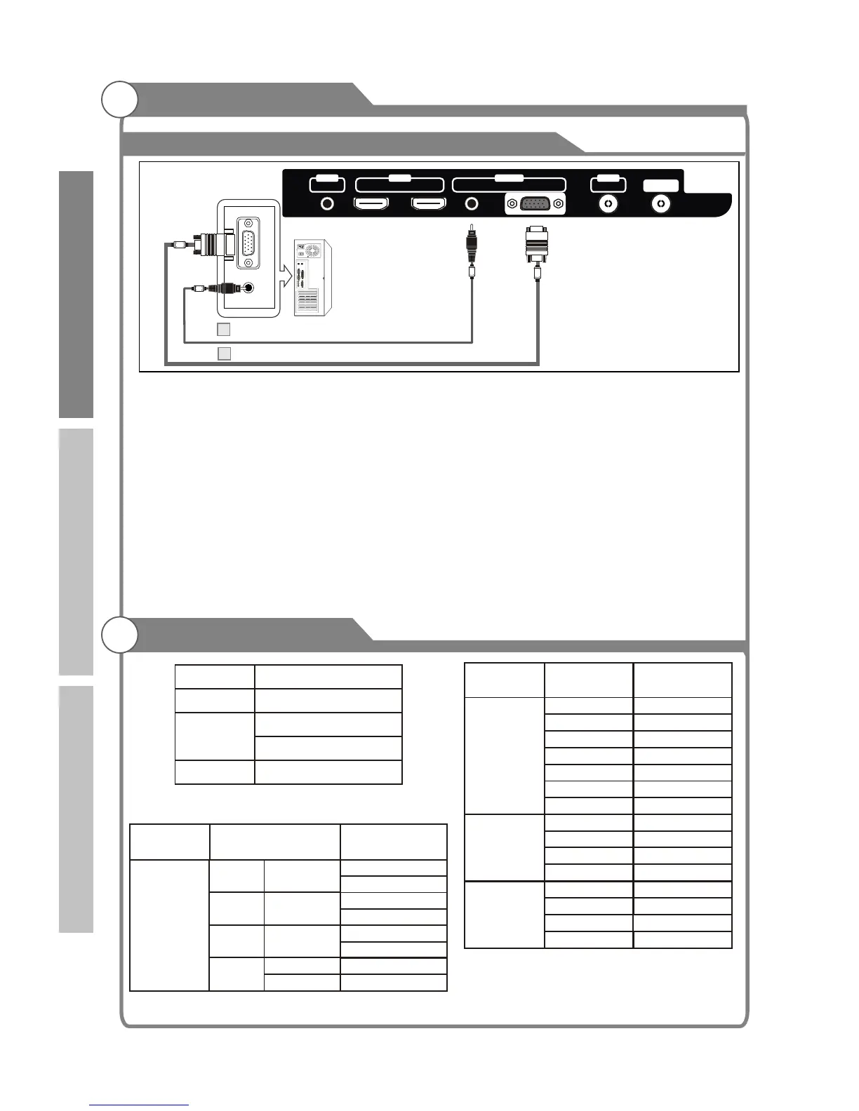 1. Connect a D-Sub Cable between VGA/PC IN connector on the TV and the PC output