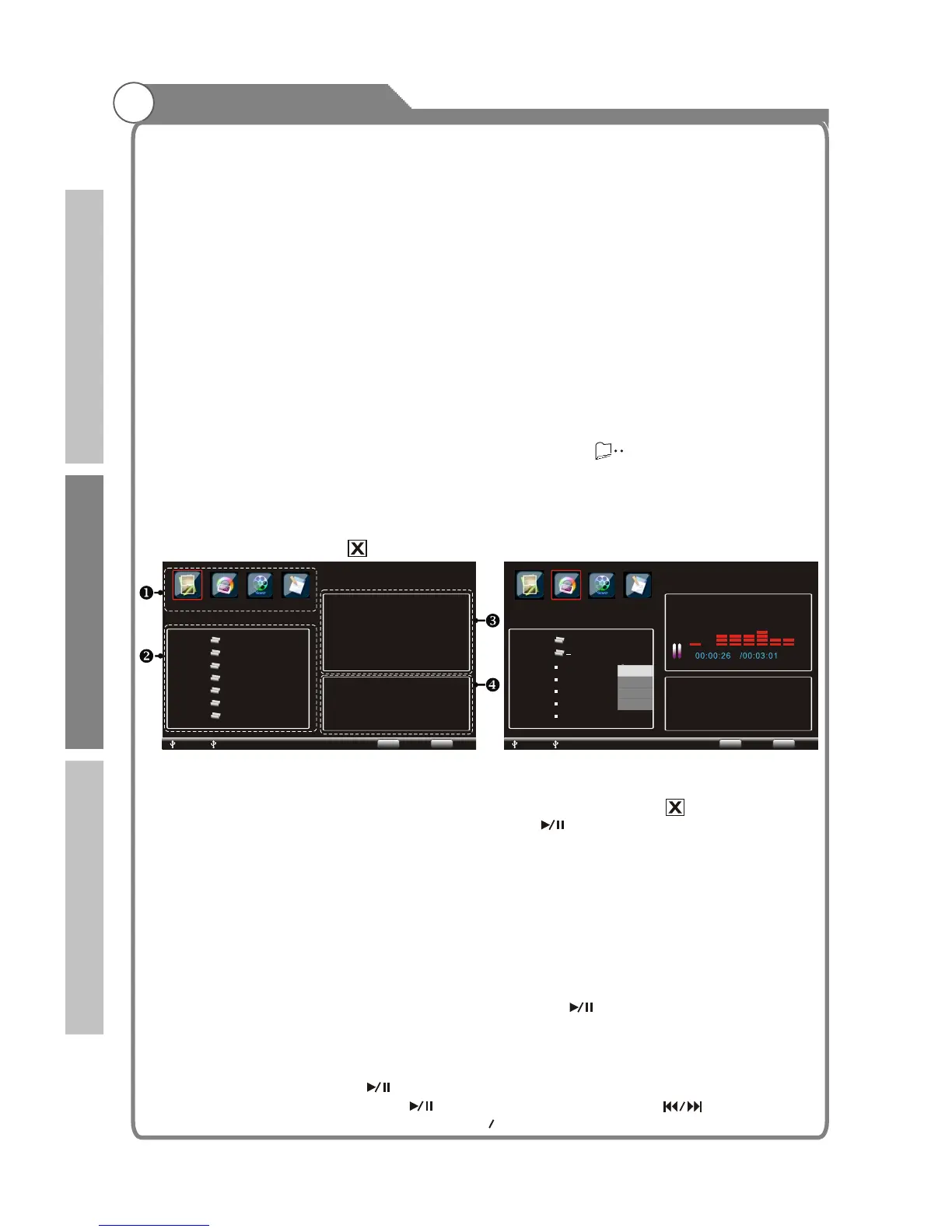 5. When the file is playing, press “ ” button to play/pause ,press “ ” button to