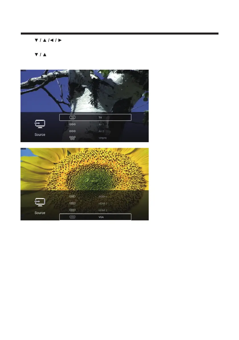 Press button to select TV/AV1/AV2/YPBPR/HDMI1/HDMI2/HDMI3/VGA.