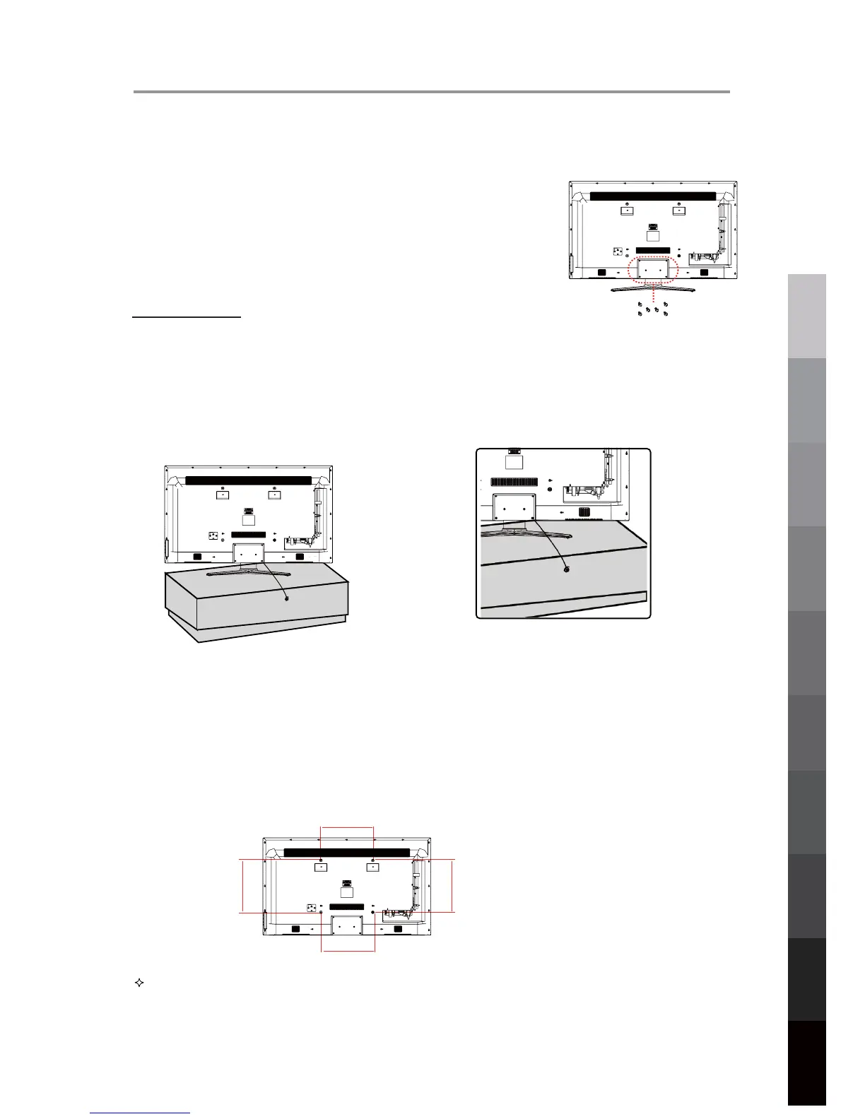 We recommend removing the TV stand prior to mounting the TV on the wall. Please refer to the figures and procedure below.
