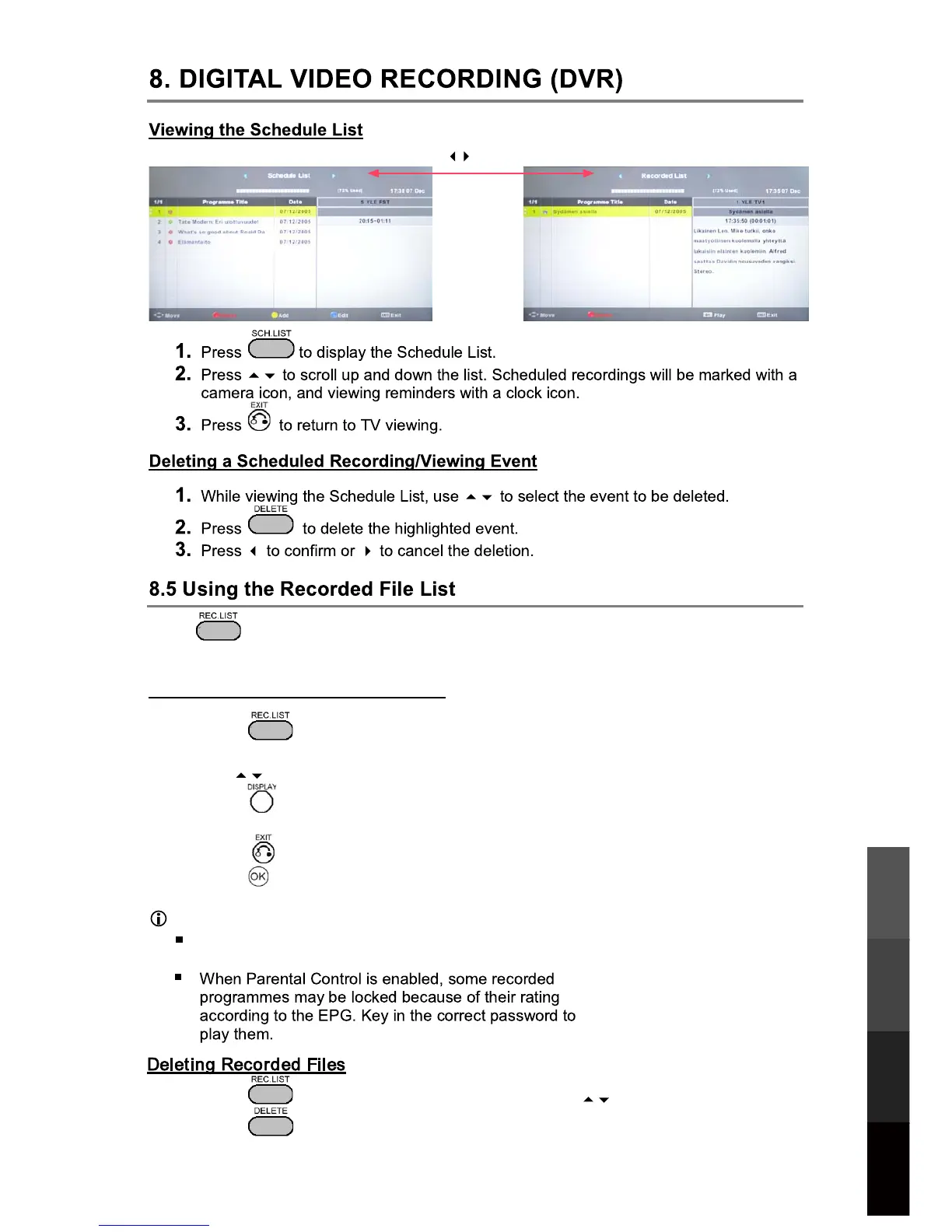Press to access the Recorded File List. Any recorded TV programmes will be listed if