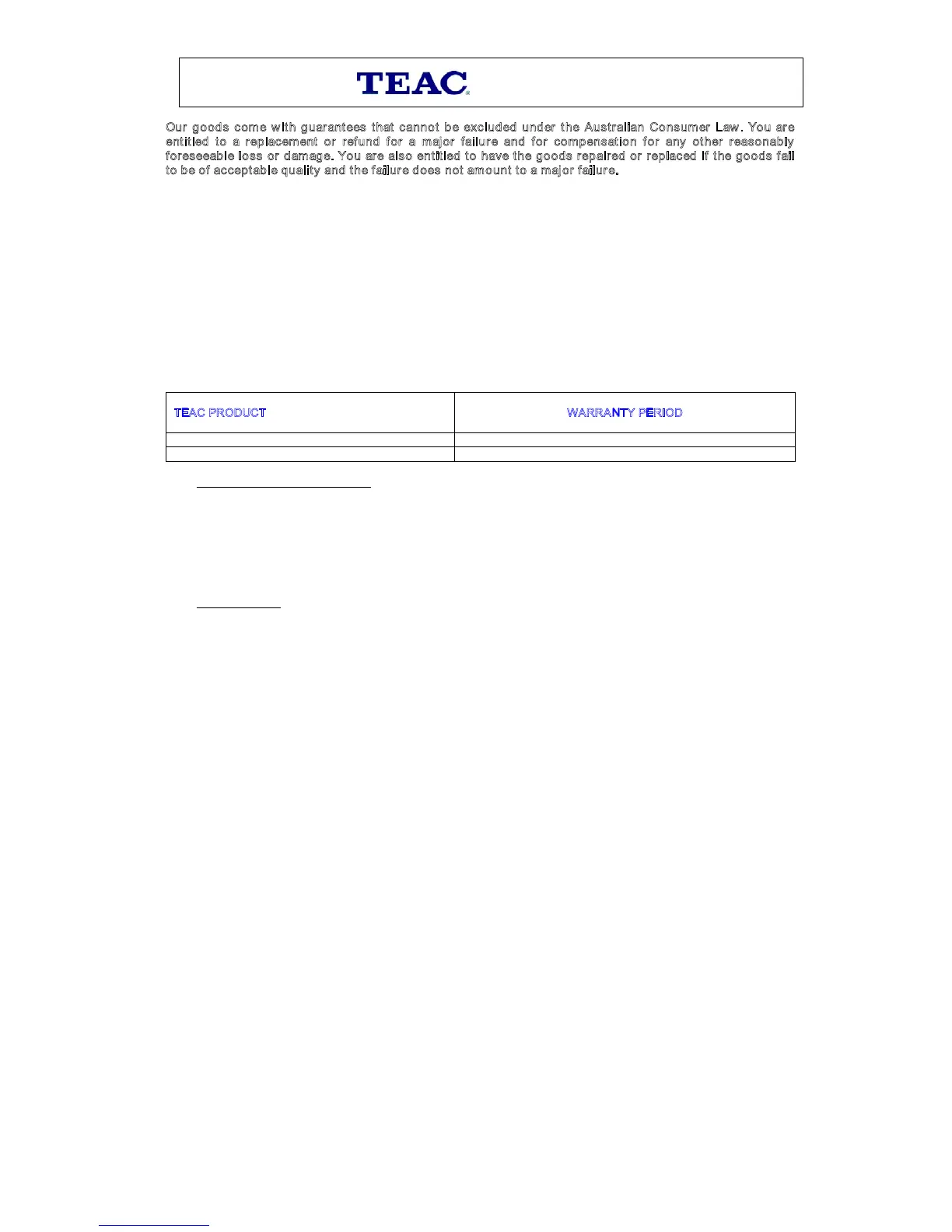 warranty only applies to TEAC products purchased, used and serviced in Australia.
