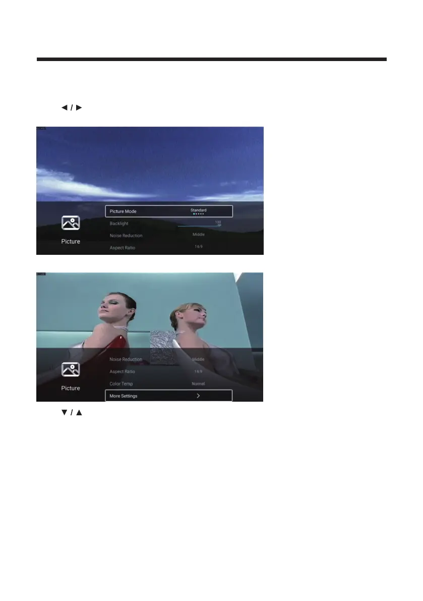 Backlight/Noise Reduction/Aspect Ratio/Color Temp/More Settings.