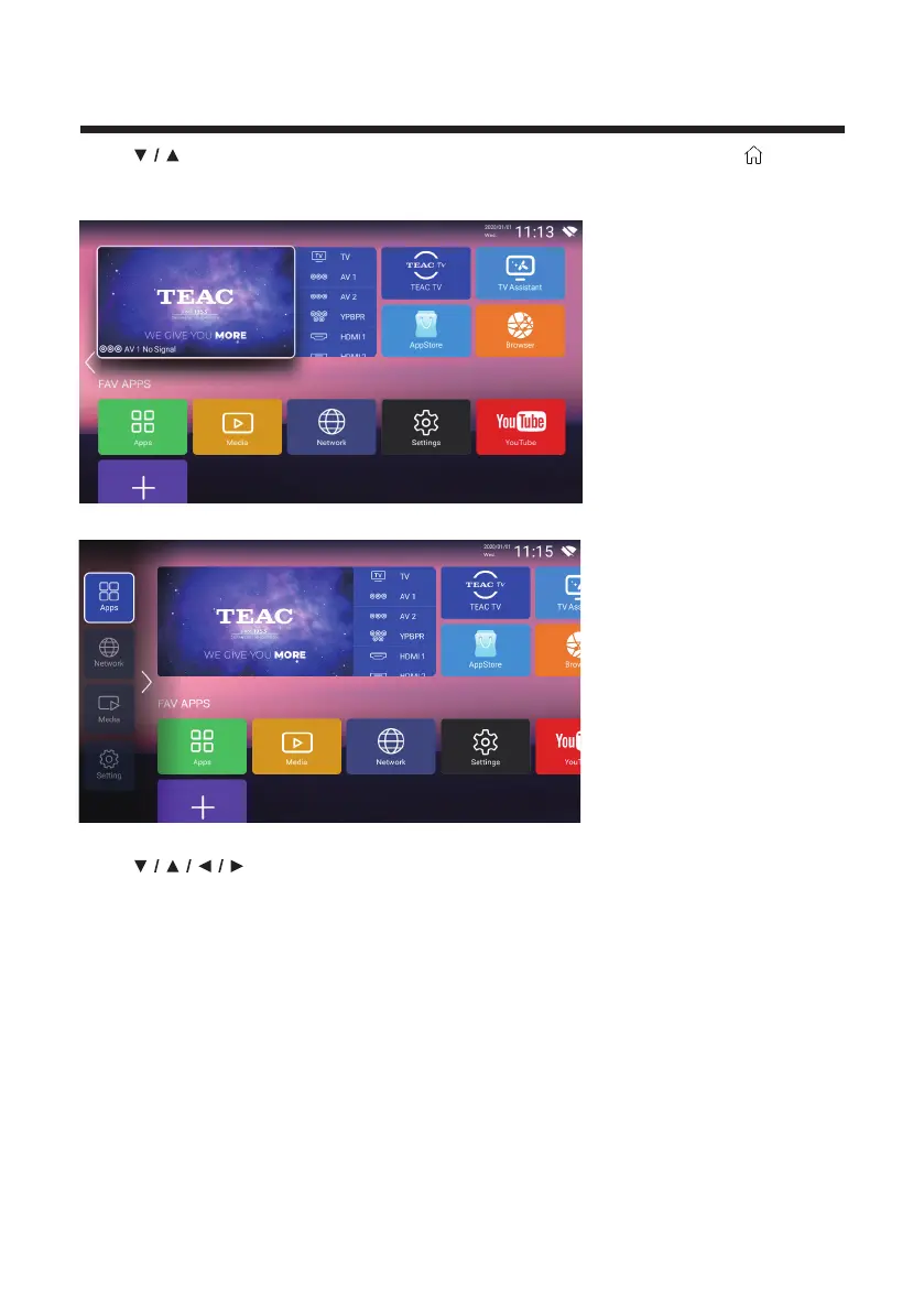 Press button to select TEAC TV/Apps/Media/Network/Settings etc.