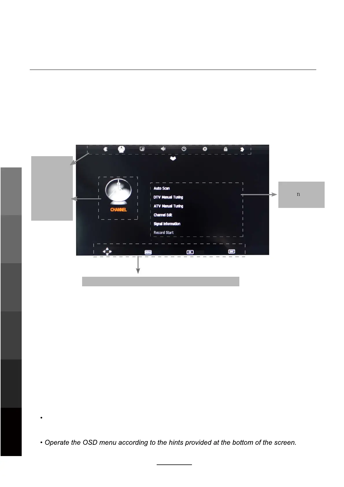 Use the </> direction buttons to make a selection from the main menu (CHANNEL,