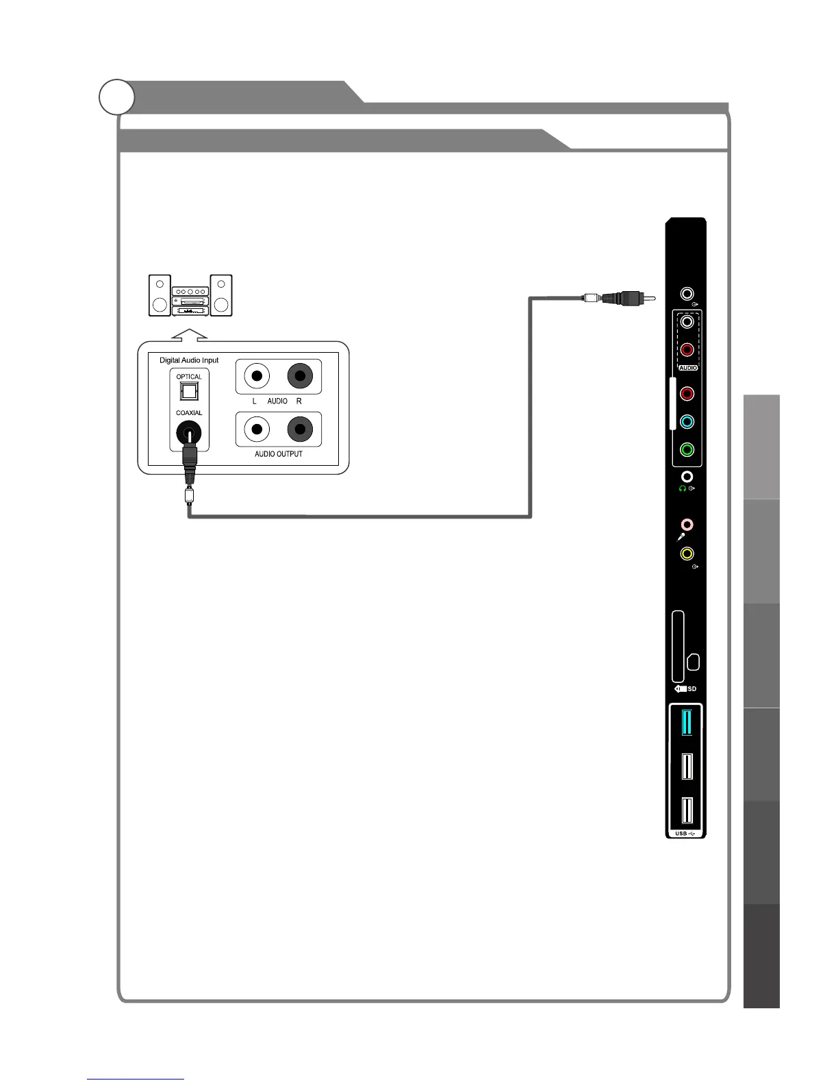 1. Connect a Coaxial Cable between the SPDIF jacks on the TV and the Digital Audio Input