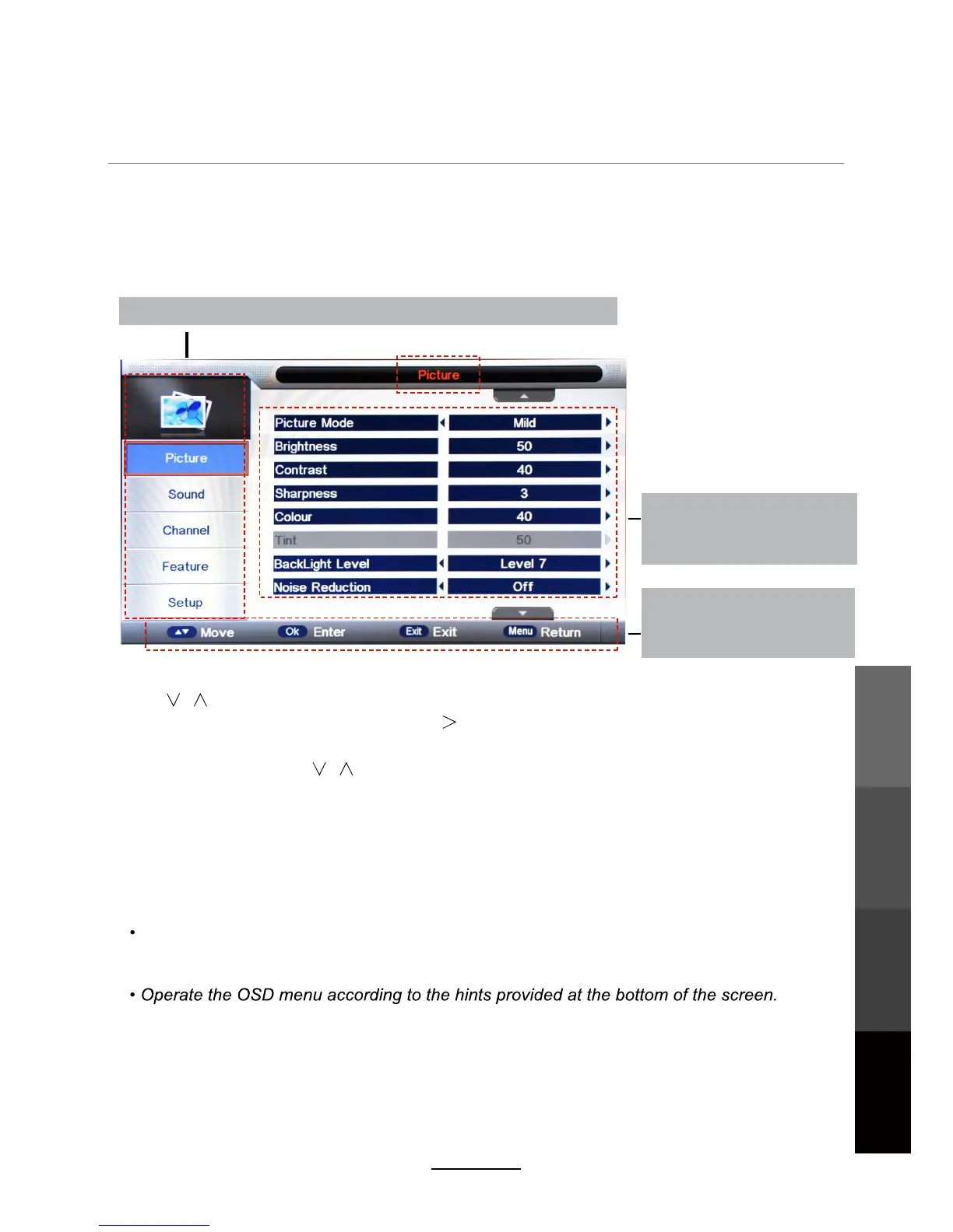Use the / direction buttons to make a selection from the main menu (PICTURE, SOUND,