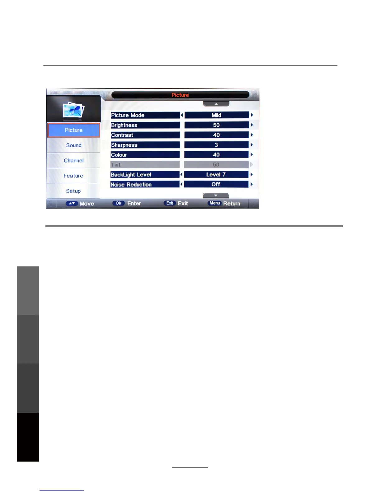 Picture Mode: Select your desired picture mode. (Dynamic, Standard, Mild, User)