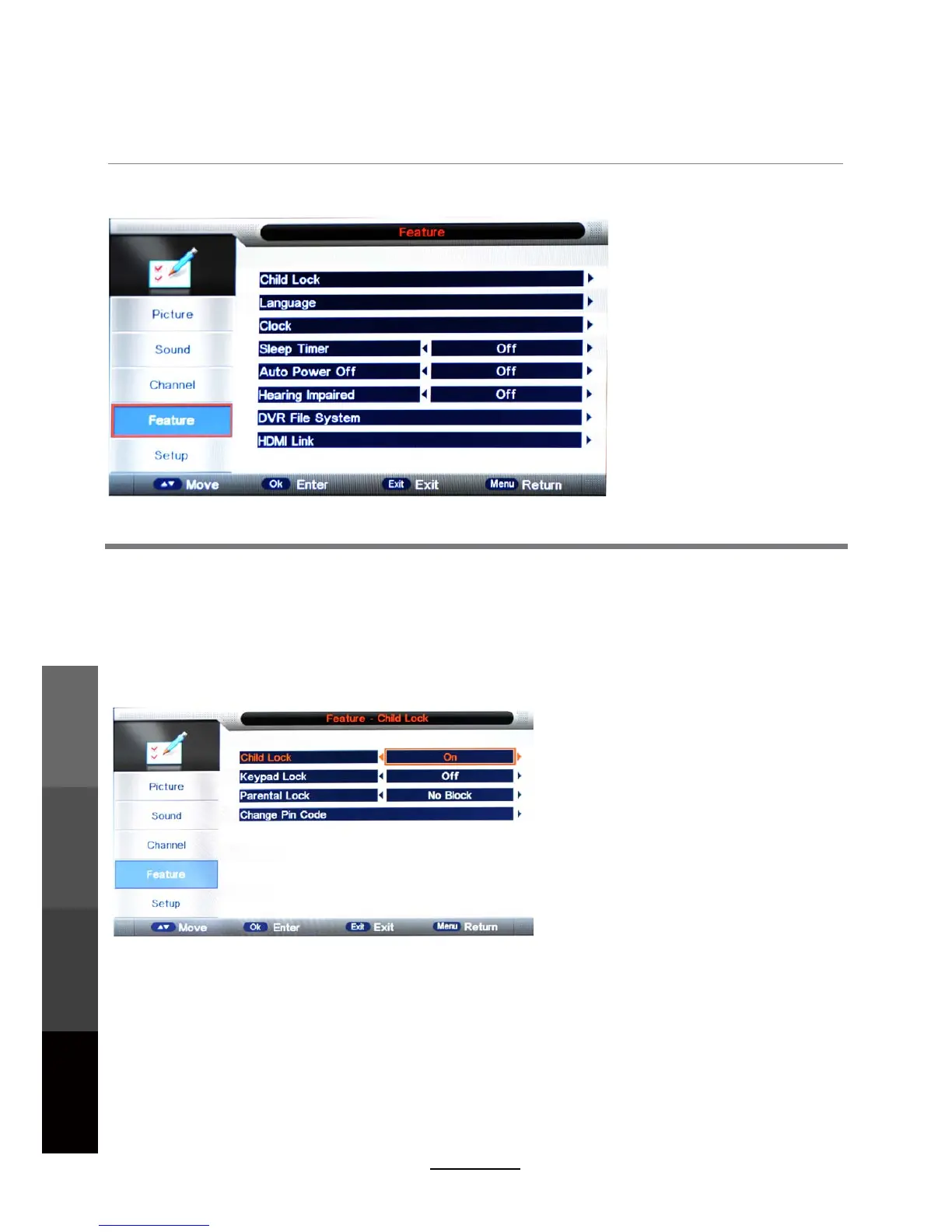 Child Lock: This menu allows you to lock certain features of the television so that they can not be