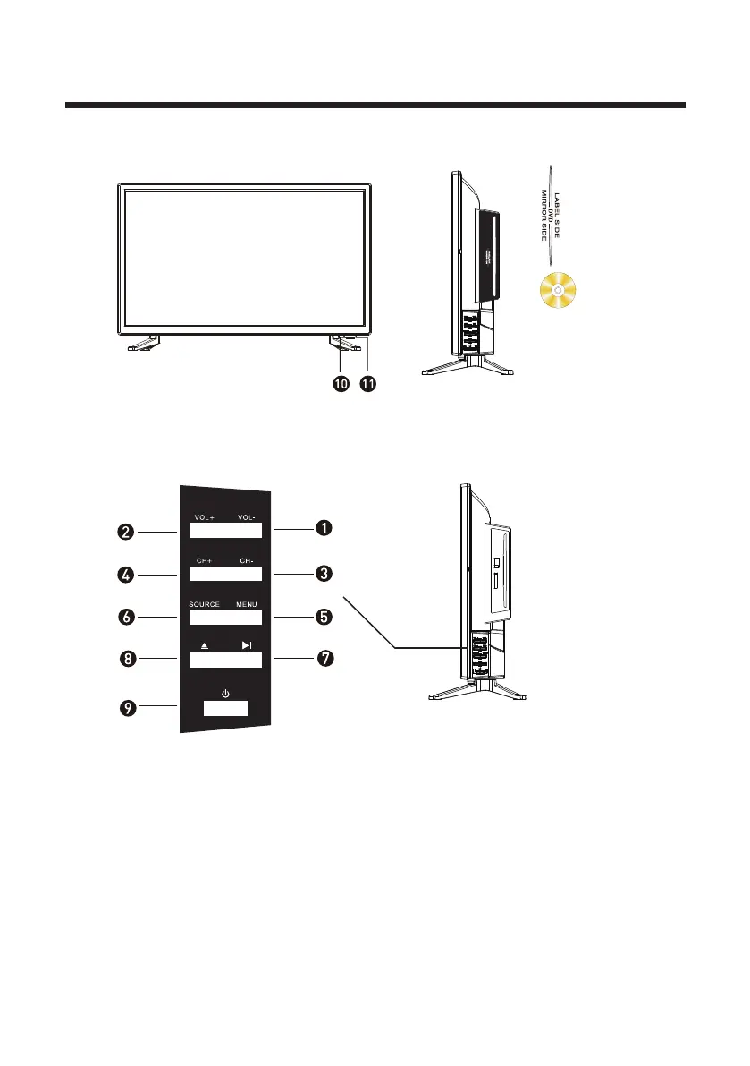 10. IR RECEIVER: Receives infrared signals from the remote control