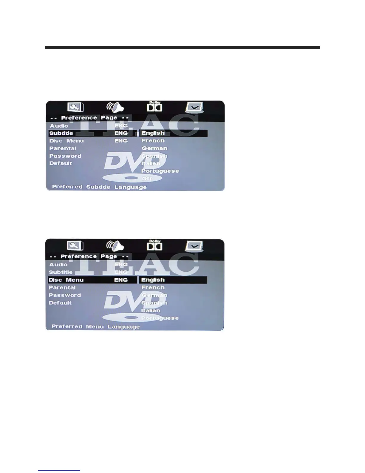Teac LEV24GD3FHD - DVD Subtitle and Disc Menu Setup; Preferred Subtitle Language