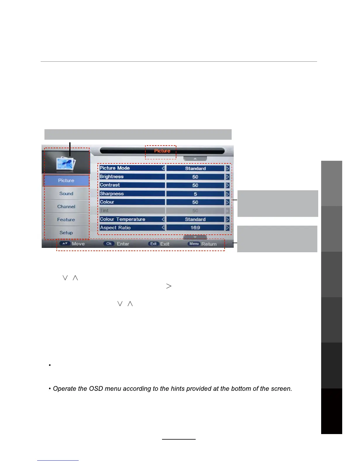 Use the / direction buttons to make a selection from the main menu (PICTURE, SOUND,