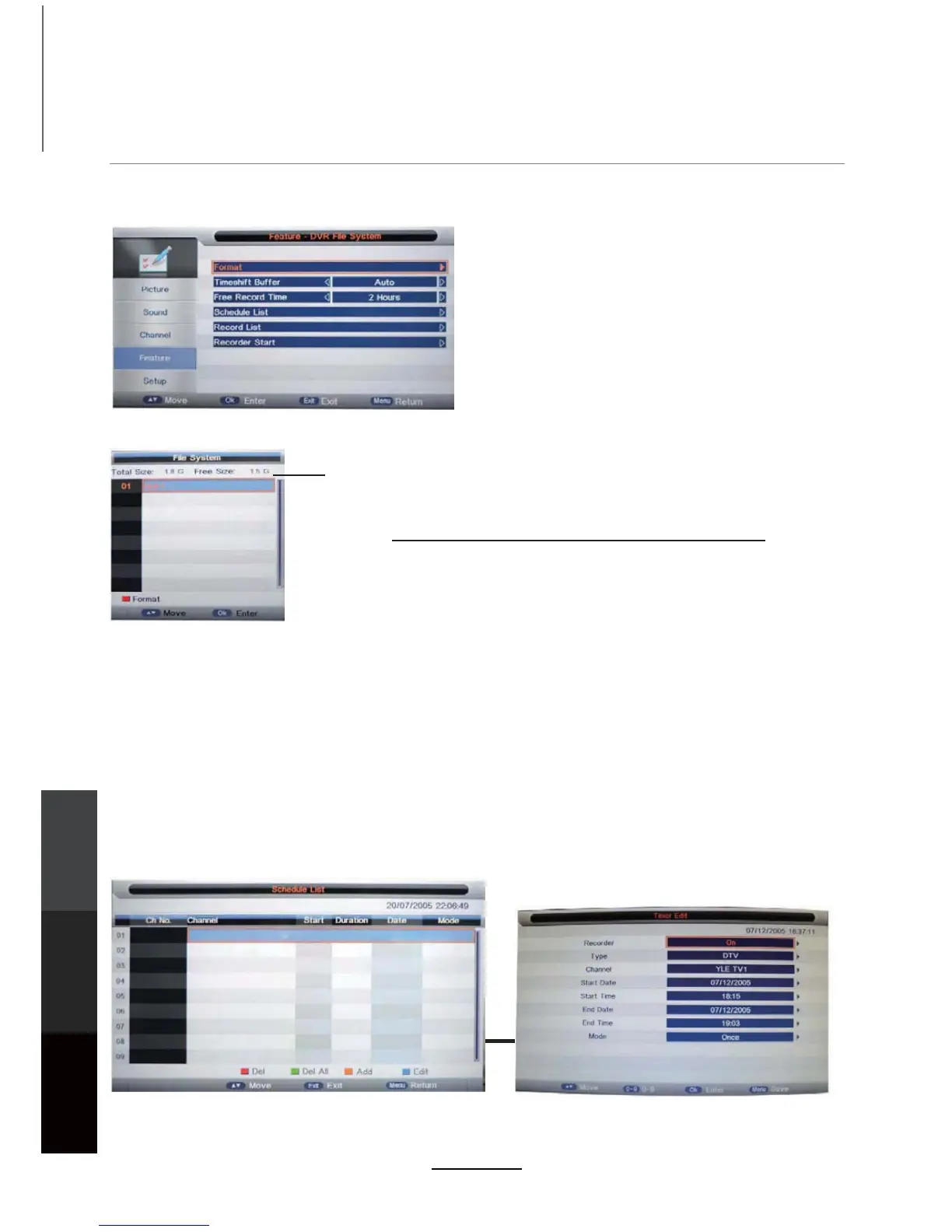 Press the MENU button, then select Feature > DVR File System. Press OK to enter the menu below.