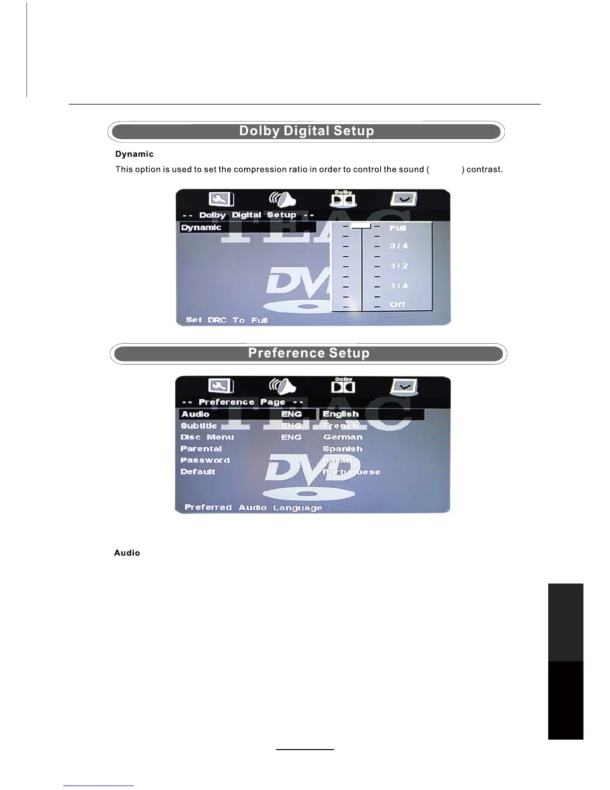 Teac LEV3294HD - DVD Operation: Dolby & Preferences; Dolby Digital Sound Settings; Preference Setup for Audio Language