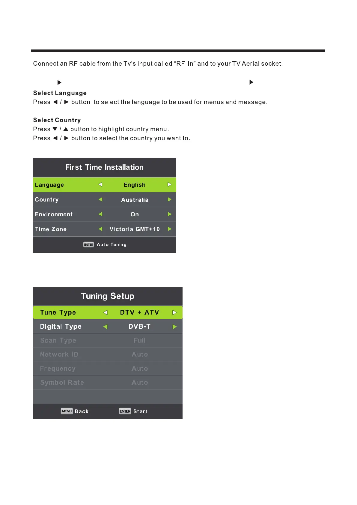 2.Press button,enter “SETUP” page,choose First Time Installation by pressing button.