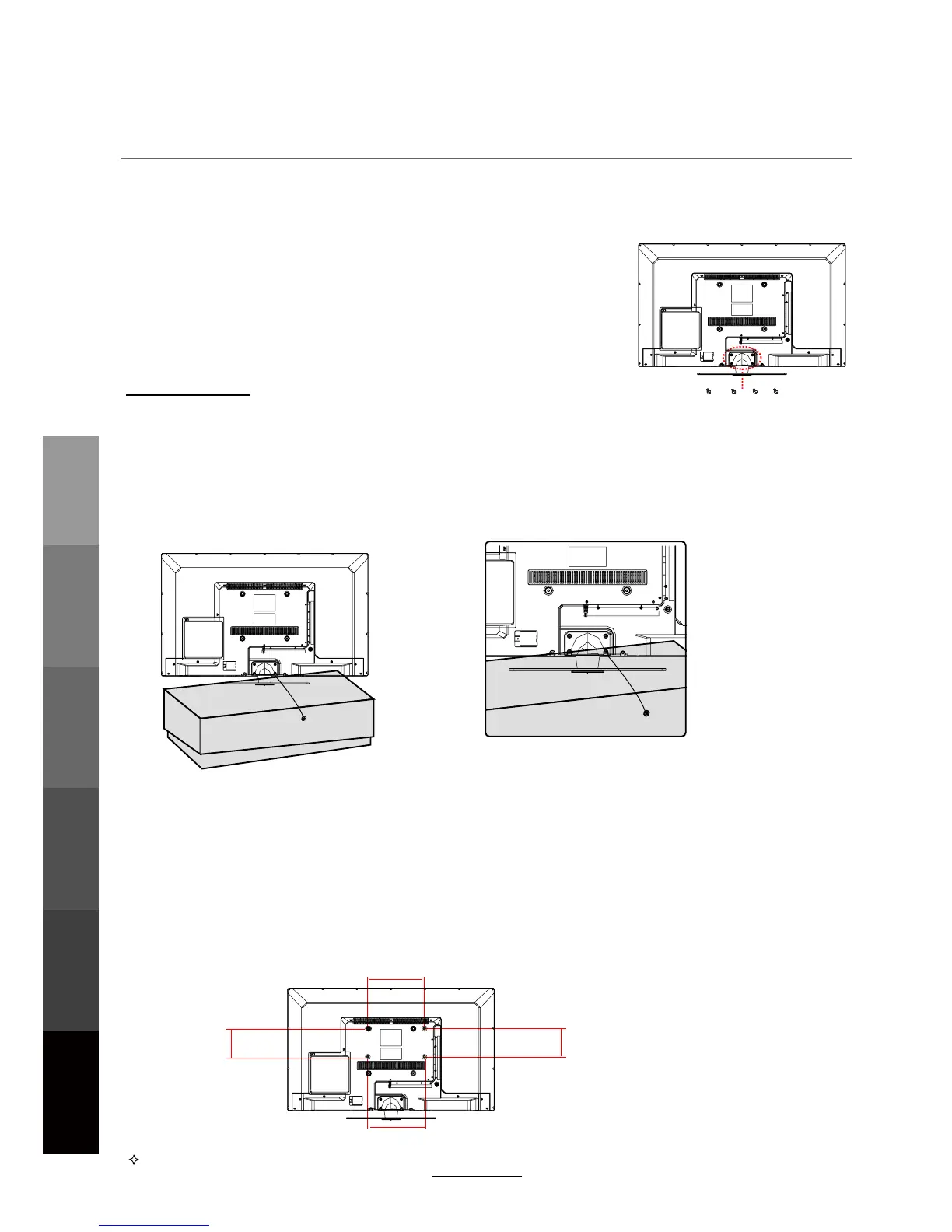 We recommend removing the TV stand prior to mounting the TV on the wall. Please refer to the figures and procedure below.