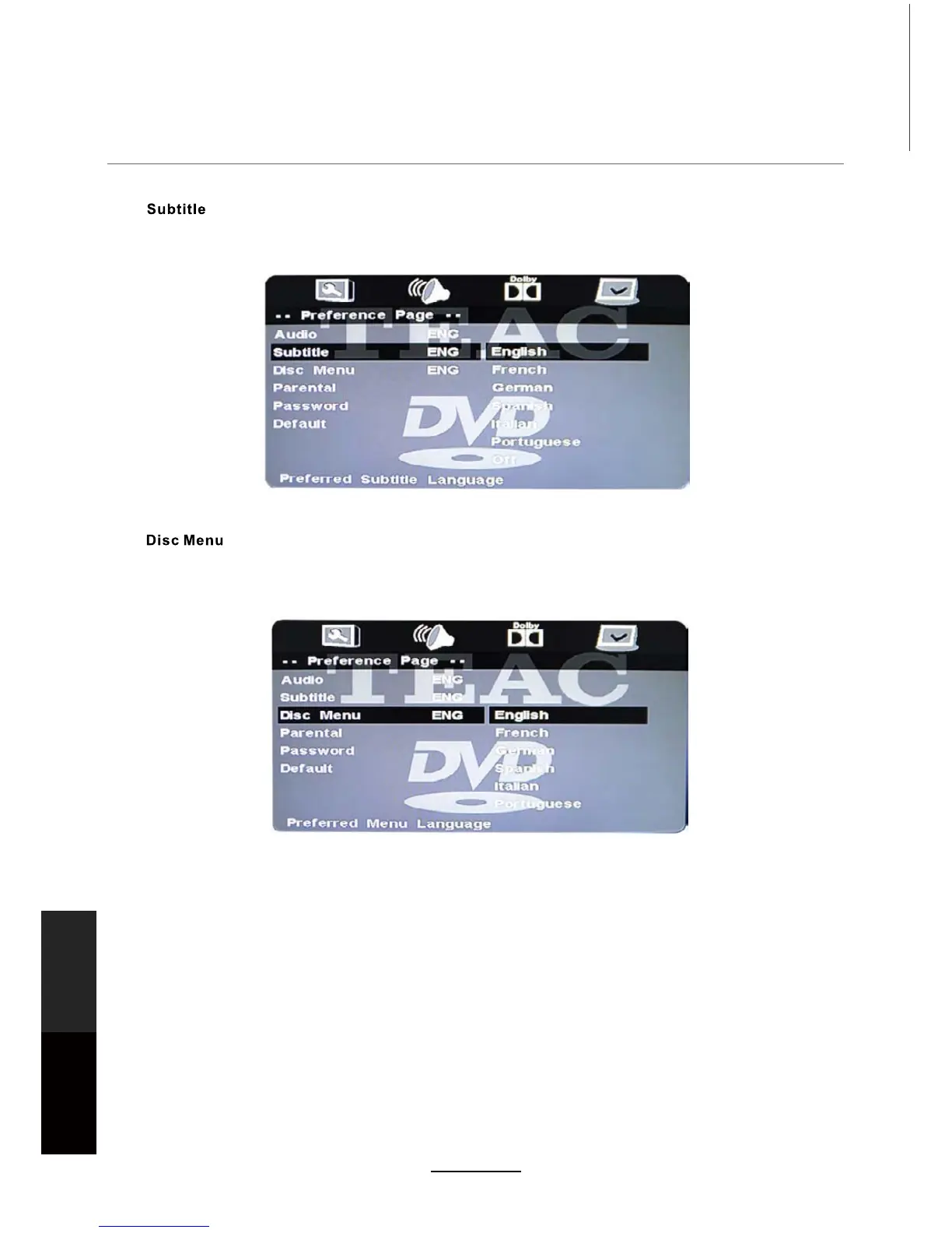 Teac LEV3992FHD - DVD Operation: Subtitle and Menu Language; Subtitle Language Selection; Disc Menu Language Selection