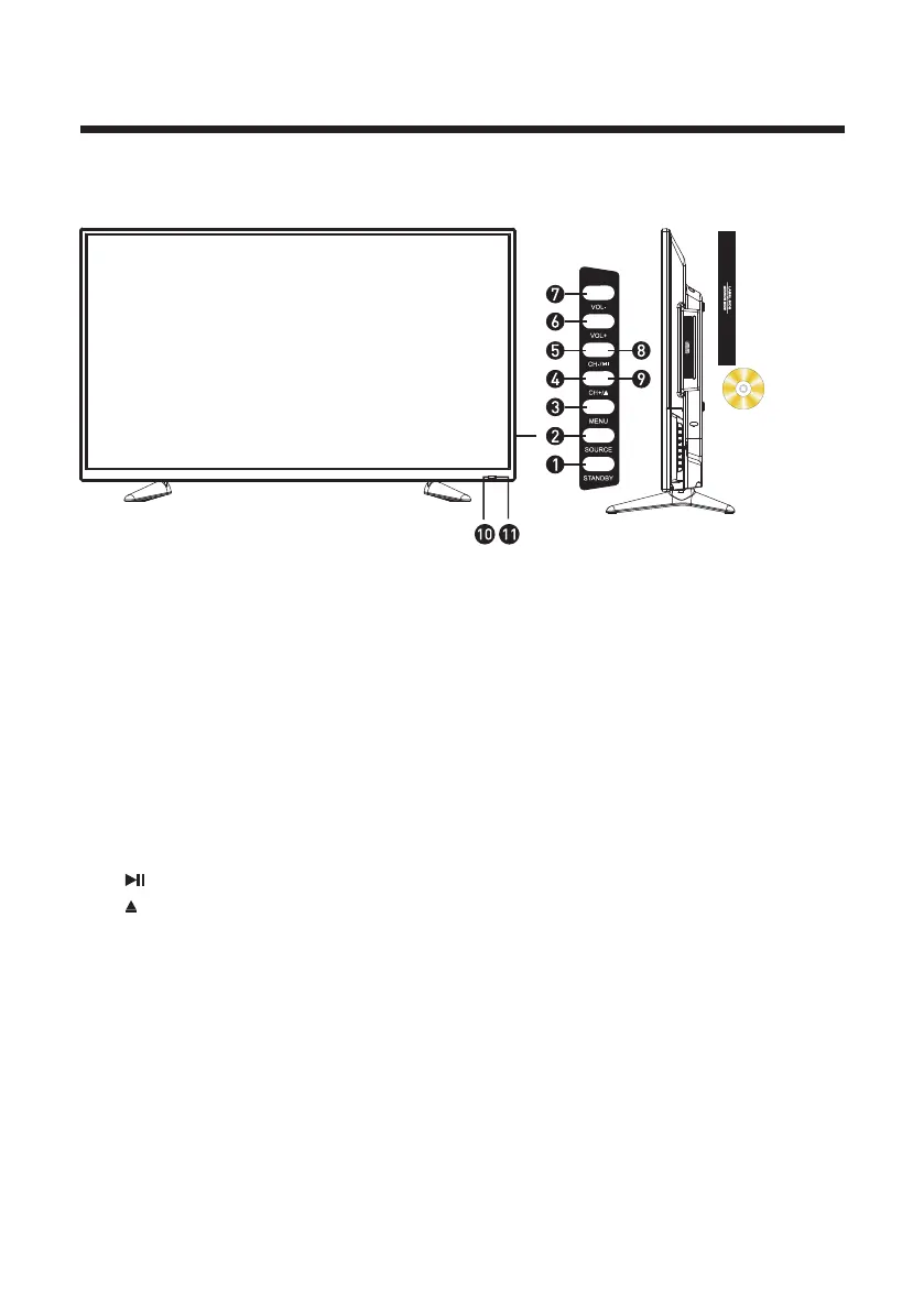 10. IR RECEIVER: Receives infrared signals from the remote control