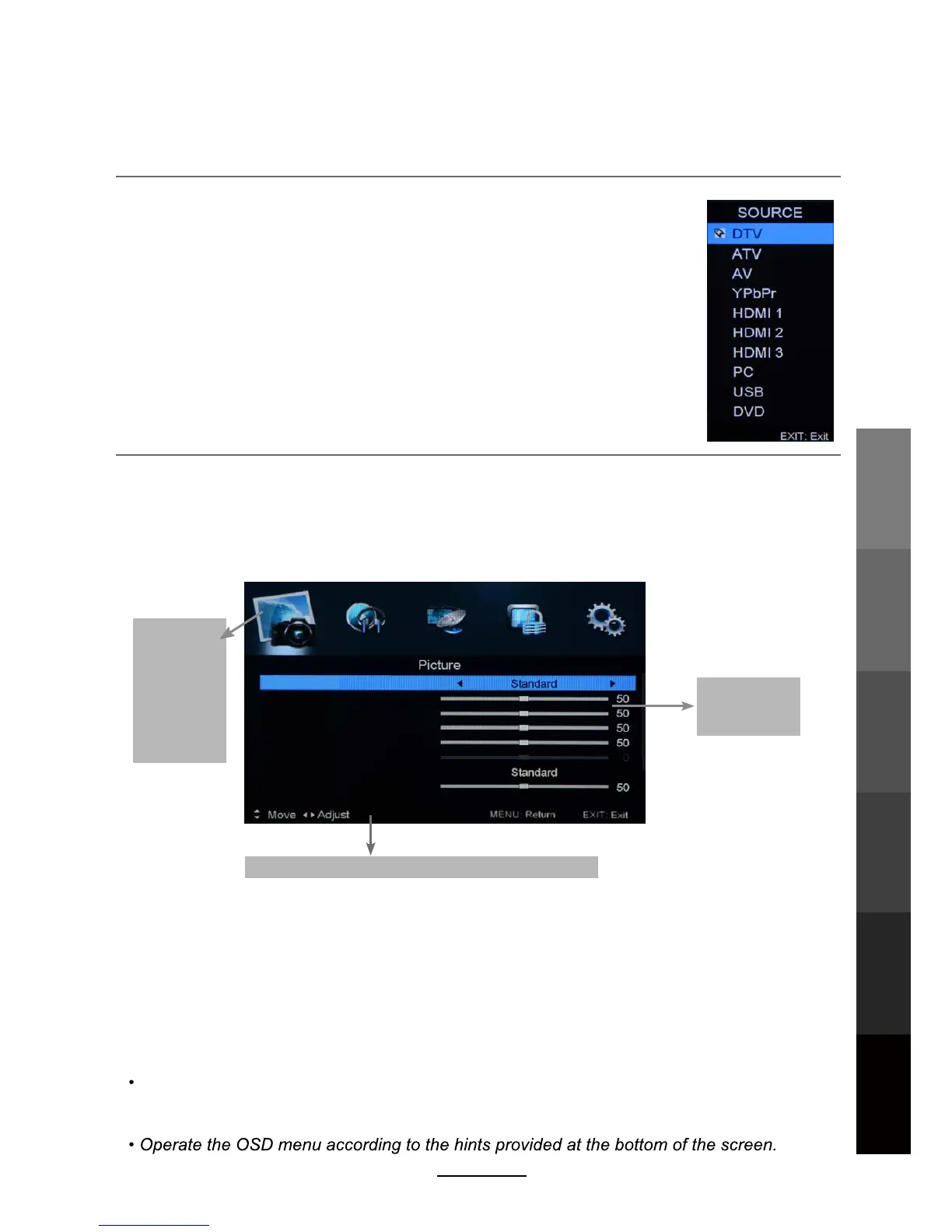 Use the </> direction buttons to make a selection from the main menu ( PICTURE,SOUND,
