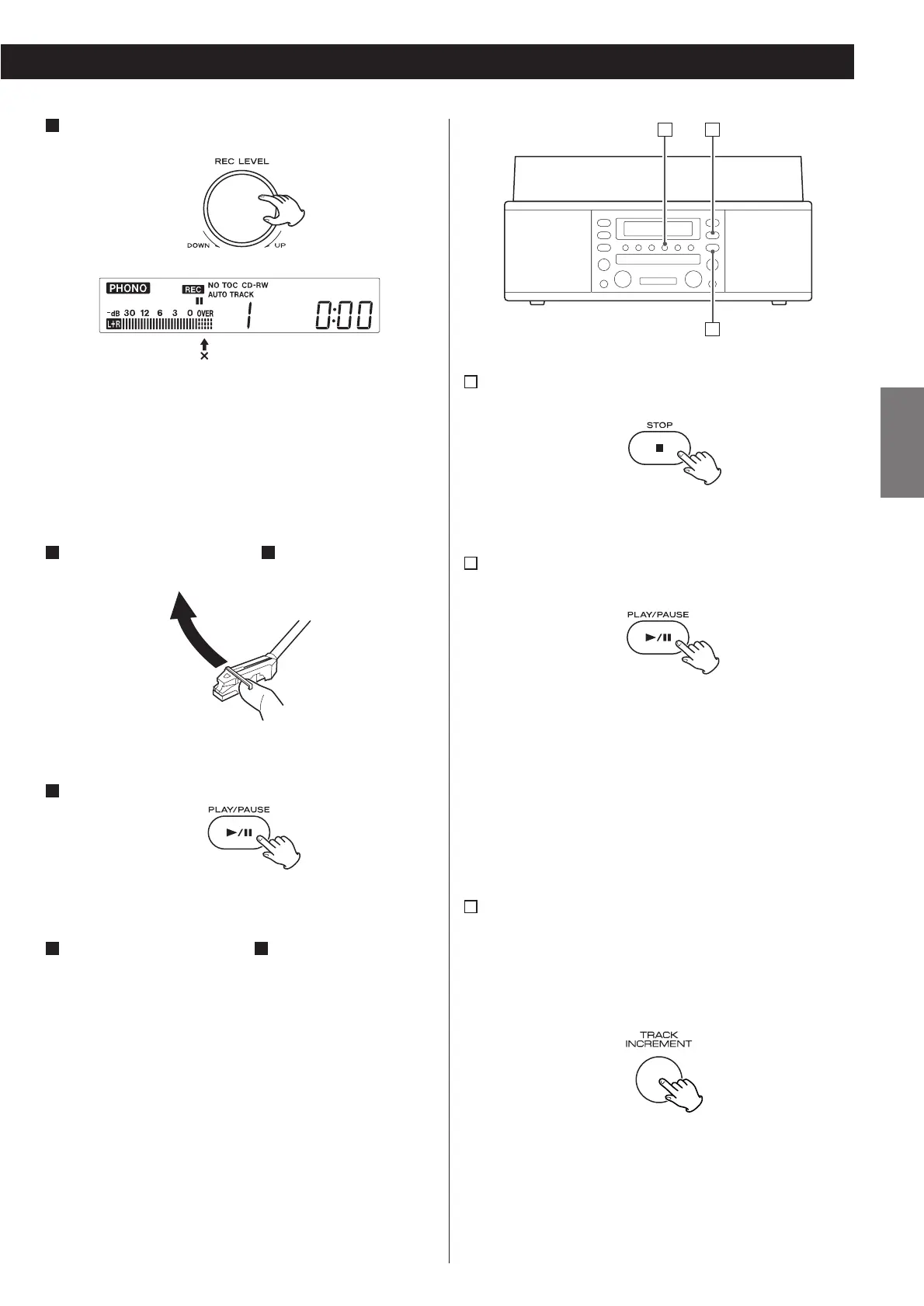 To restart recording, press the PLAY/PAUSE button (y/J)